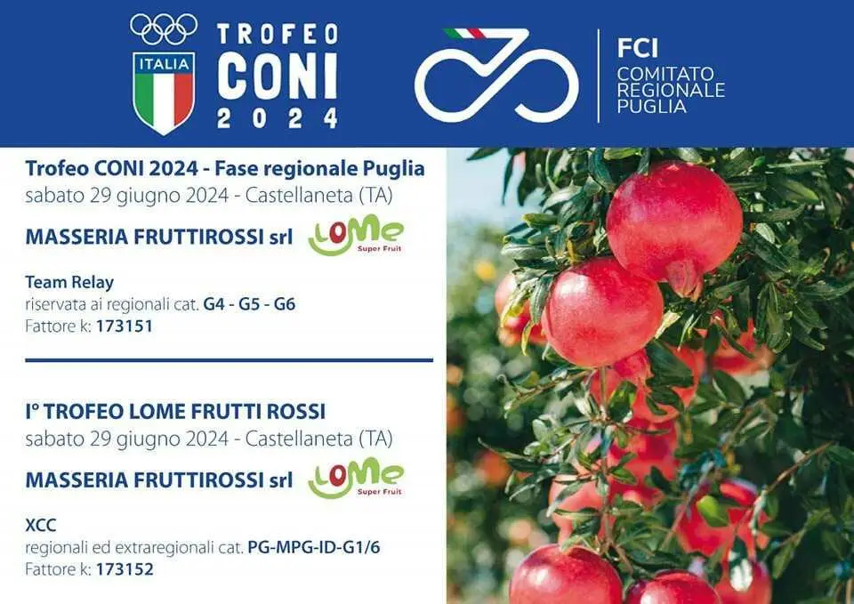 Un intero pomeriggio dedicato al ciclismo e al benessere, tra i campi di melagrane, per i giovanissimi appassionati delle due ruote, e non solo! Sabato 29 giugno, a partire dalle ore 14.30 a Castellaneta Marina, in contrada Terzo Dieci presso lo stabilimento di Masseria Fruttirossi Lome Super Fruit, si terranno due gare di ciclismo per gli under 13: il Trofeo CONI e il Trofeo Lome Fruttirossi. La manifestazione vede limpegno organizzativo del Ciclo Team Laerte di Laterza, una garanzia di successo, in condivisione con il marchio Lome Super Fruit di Masseria Fruttirossi a cui è intitolata la manifestazione; location delle due gare, infatti, sarà proprio lazienda agritech di Castellaneta Marina. Il primo evento coincide con la fase regionale di qualificazione al Trofeo CONI nella quale parteciperà la rappresentativa giovanile pugliese per la fase nazionale in programma tra il 3 e il 6 ottobre a Catania. Come da regolamento Trofeo CONI sono ammessi team composti da quattro elementi G4-G6 di cui un G4 e una ragazza per effettuare il team relay (staffetta). Il secondo evento è una gara di short track con percorso ricavato allinterno della Masseria Fruttirossi, dove a partire dalle ore 14.30 è fissato il raduno dei partecipanti, e lo svolgimento di tutte le partenze dai G1 ai G6 (dalle 16:00 in poi compresa la fase di qualificazione regionale al Trofeo CONI). Masseria Fruttirossi è sponsor della Federazione Ciclistica regionale Puglia ed è presente con il logo di Lome SuperFruit sulla maglia ufficiale indossata dagli atleti pugliesi impegnati nelle gare su tutto il territorio nazionale. Lome Super Fruit è un brand dellazienda agritech pugliese Masseria Fruttirossi, principale produttore italiano di melagrana, superfrutto che trasforma nei succhi Lome Super Fruit, 100% solo frutta spremuta a freddo senza zuccheri, coloranti e conservanti aggiunti, un naturale concentrato di salute. Annunciando liniziativa Dario De Lisi, direttore commerciale di Masseria Fruttirossi, ha spiegato che «il ciclismo è uno sport la cui pratica a tutti i livelli, dal dilettante allatleta professionistico, contribuisce al benessere della persona, la stessa filosofia alla base del progetto Lome Super Fruit di Masseria Fruttirossi che vede coltivare e trasformare in succhi solo frutti che, come la melagrana, hanno straordinarie qualità salutistiche naturali, lideale complemento della dieta dello sportivo». «Per questo a Masseria Fruttirossi ha poi detto Dario De Lisi è sembrato naturale sostenere il progetto di Federciclismo Puglia avviando un percorso che, nellarco di quattro anni, si svilupperà progressivamente. Siamo sicuri che tutti coloro che hanno a cuore la propria salute dedicandosi con passione al ciclismo, sapranno apprezzare i succhi Lome Super Fruit ricchi di sostanze nutraceutiche naturali, come antiossidanti e antinfiammatori, un gustosissimo concentrato di salute, tutto naturale, infatti i nostri prodotti hanno anche la certificazione Vegan OK».