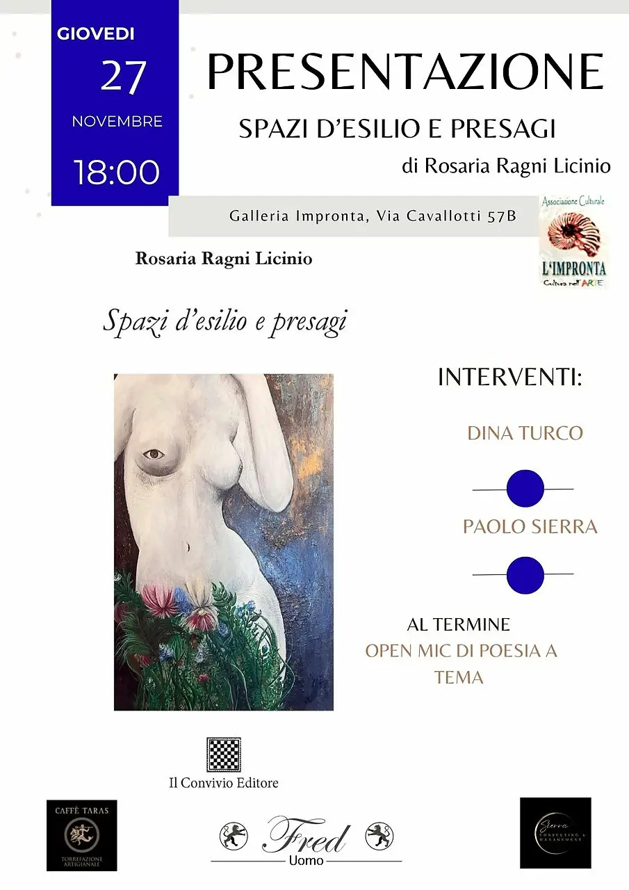 Giovedi 27 novembre, alle ore 18:00, Rosaria Ragni Licinio presenterà la sua nuova raccolta poetica, Spazi d’esilio e presagi (Il Convivio Editore), presso la Galleria l’Impronta in via Cavallotti 57b, a Taranto.