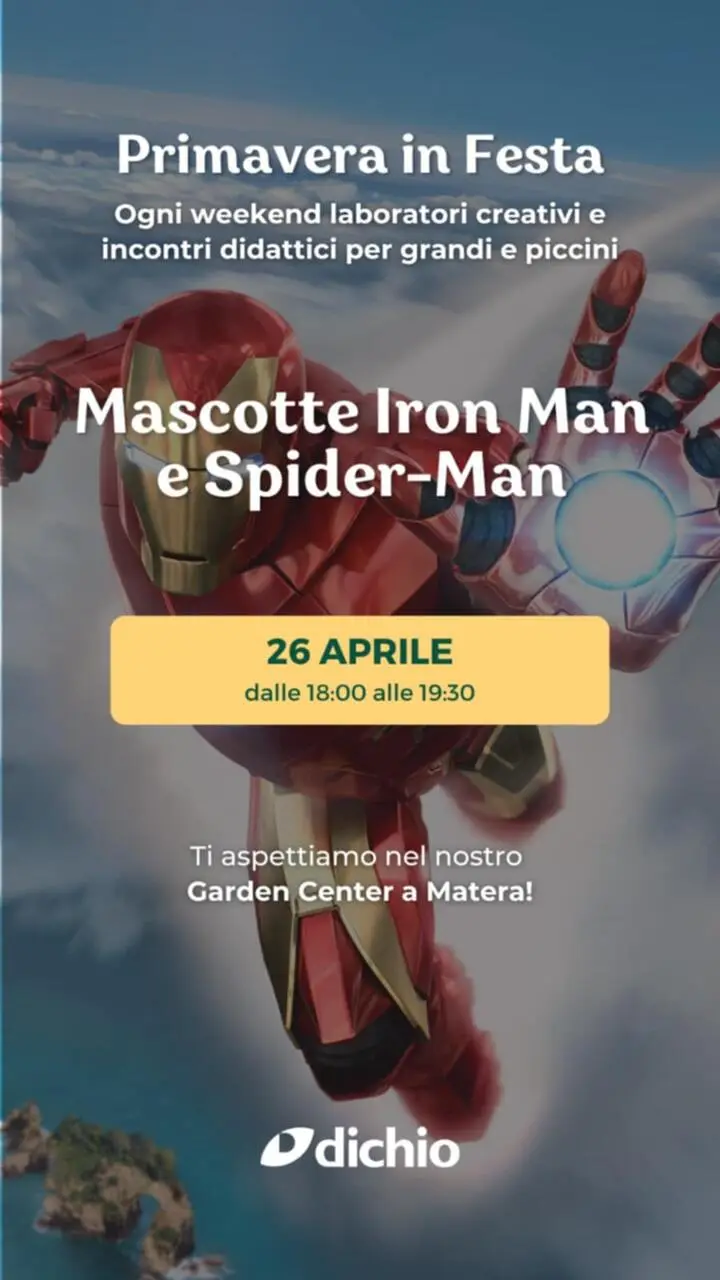 Ancora un grande evento per l’Associazione Giò Giò e i Supereroi che sabato 26 aprile, dalle 18:00 alle 19:30 presso il Dicho Garden Center di Matera (nei pressi del Centro Commerciale Mongolfiera Matera Venusio, SS 99) con Iron Man e Spider Man animeranno il pomeriggio facendo divertire tutti i presenti e scattando tante foto. Non mancate…