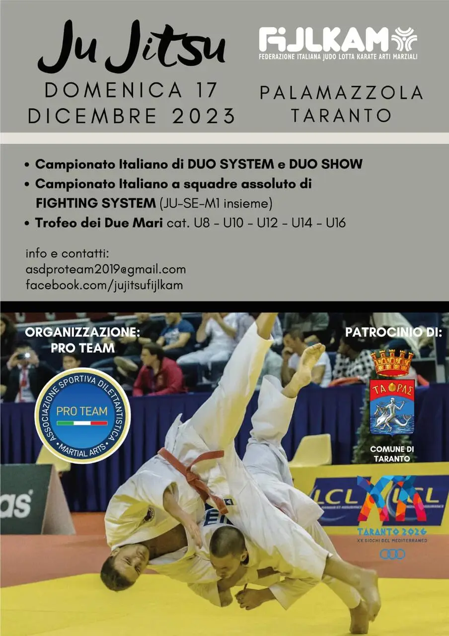L’organizzazione dell’evento è curato dalla Pro Team e dal Maestro Raffaele Buovolo DT Pro Team Jujitsu e responsabile degli eventi della commissione nazionale Jujitsu. Si ingrazia il Comune di Taranto; il Maestro Pasquale Di Bari Presidente della Pro Team; e poi ancora il referente Regionale Puglia Jujitsu FIJLKAM Maestro Roberto Di Maggio e il Delegato Provinciale FIJLKAM Puglia Roberto De Ronzi. Si ringrazia, inoltre, per la collaborazione la Dottoressa Elena D’Arcangelo componente della consulta dei Giochi del Mediterraneo 2026.