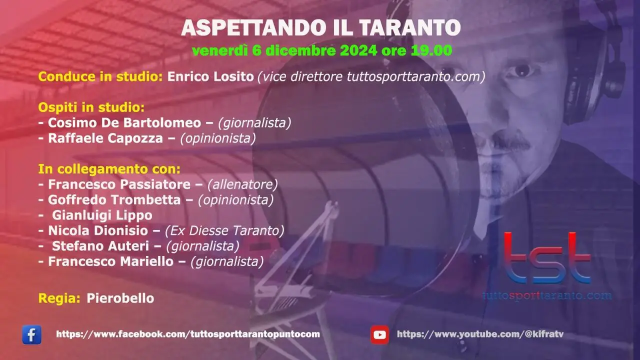 Venerdì 6 dicembre dalle ore 19:00, appuntamento con “ASPETTANDO IL TARANTO”, il contenitore sportivo a cura della redazione di Tutto Sport Taranto.com condotto da Enrico Losito con la regia di Piero Bello. Nel corso della puntata tratteremo le tematiche di stretta attualità del Taranto Fc 1927 in particolare della cessione societaria della sconfitta dei rossoblu nella trasferta di Biella contro la Juve Next Gen proiettandoci verso la gara Taranto-Catania. Dagli studi della nostra redazione di Ki.Fra Tv avremo come ospit della puntata: il giornalista Cosimo De Bartolomeo e l’opinionista Raffaele Capozza mentre in collegamento esterno ci saranno: l’allenatore Francesco Passiatore; i nostri opinionisti Goffredo Trombetta e Gianluigi Lippo; Nicola Dionisio , ex direttore sportivo del Taranto, il giornalista Francesco Mariello e da Catania Stefano Auteri, giornalista di “Catanista”. Vi aspettiamo in diretta sulle pagine ufficiali Facebook e Youtube di Tutto Sport Taranto e Ki.fra tv dalle ore 19:00 con le vostre domande, commenti e opinioni…NON MANCATE!!! Il contenitore sportivo è stato realizzato grazie al supporto di Ipersport in via per S. Giorgio Jonico km 10 (contrada Cimino) a Taranto; Studio Radiologico San Tommaso in via Luigi Settembrini, 232 a Talsano (TA); Studio Fornaro-Occhinegro dottori commercialisti associati, in Piazzale Dante, 8 a Taranto; in via Skanderbeg, 64 a Bari e in via Einaudi, 10 a Locorotondo (BA); Ottica Dierre in Corso Italia, 329/331 a Taranto; Birroteca Puglia in via Cataldo Nitti, 14 a Taranto; Erario Ottavio Srls – Costruzioni edilizie in via Don Minzoni, 2 a Manduria (TA), Guernica - cucina pizzeria tarantina in via Acclavio, 4-10 a Taranto, Peperoncino Rosso Trattoria, via S. Francesco 13/b a Statte (TA).