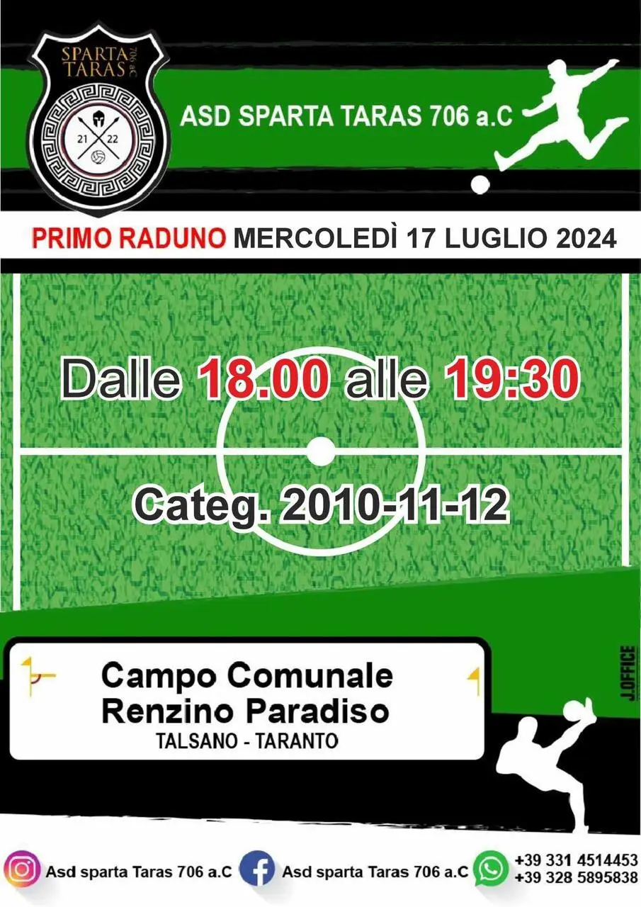 Dopo una leggera pausa lo Sparta Taras riapre i battenti con il primo raduno per categorie 2010, 2011 e 2012 che si terrà mercoledì 17 luglio dalle 18 alle 19:30 presso il campo Comunale "Renzino Paradiso" di Talsano. Oltre ai sempre attenti allenatori importante anche la presenza del preparatore dei portieri, ex estremo difensore del Taranto e di altri club di serie B, Nicolas Bremec. Per maggiori info chiamare il 3314514453 o il 3285895838.