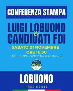 Sabato 1 novembre 2025, alle ore 10.30, si terrà una conferenza stampa presso l’Hotel Delfino di Taranto, dedicata alla presentazione dei candidati di FdI al consiglio regionale della Puglia. Sarà presente il candidato Presidente Luigi Lobuono, insieme ai rappresentanti di Fratelli d’Italia che illustreranno le strategie e le proposte per il futuro della regione.L'incontro rappresenta un'importante opportunità per i giornalisti e i cittadini di ascoltare direttamente i candidati e porre domande sul programma e sulle iniziative che s’intendono perseguire anche in riferimento all’area tarantina.Invitiamo tutti gli interessati a partecipare e a condividere un momento di dialogo e confronto.On. Dario IAIA, presidente provinciale FdI Taranto.