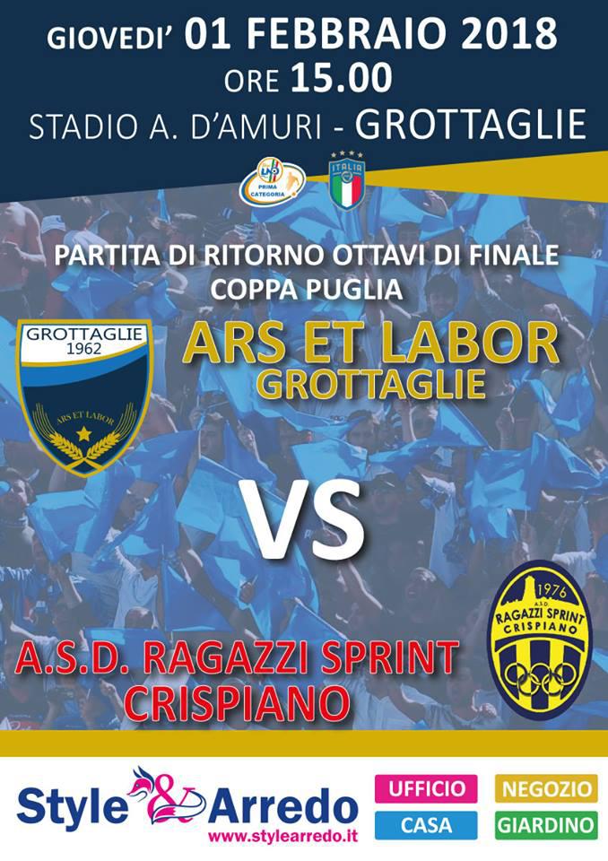 Domani pomeriggio alle 15:00, al D’Amuri, l’Ars er Labor Grottaglie incontrerà per la quarta volta in questa stagione, di cui tre negli ultimi 14 giorni, i Ragazzi Sprint Crispiano nella gara valida per il ritorno degli ottavi di finale di Coppa Puglia. Interessi diversi da parte delle due società verso la competizione e soprattutto un risultato già abbastanza significativo nella partita di andata, sono i due elementi che probabilmente condizioneranno l’atteggiamento delle squadre in campo. Nonostante questo è chiaro che il match non sarà una formalità. La partita dovrà essere giocata con attenzione senza sottovalutare l’avversario che sicuramente vorrà fare bene e soprattutto vorrà onorare l’impegno fino in fondo. Il Crispiano, seppur non favorito per il passaggio ai quarti, ha orgoglio e tenacia da vendere e non sarà la vittima sacrificale. Ricordiamo che in Coppa vige il regolamento Uefa, ovvero: a parità di risultato i goal segnati in trasferta valgono doppio. Il Crispiano per passare il turno dovrà necessariamente vincere con più di 3 goal di scarto mentre il Grottaglie ha due risultati su tre a disposizione, vittoria o pareggio. Qualora la partita, al temine dei novanta minuti, dovesse finire 3 a 0 per il gli ospiti si disputeranno due tempi supplementari da 15 minuti ed eventualmente i calci di rigore. Turn-over obbligato per mister Marinelli che dovrà fare a meno di Gigantiello, espulso all’andata e appiedato per due giornate, di Amaddio, di Carbone e di Fonzino fermati dal giudice sportivo per una giornata, per il Crispiano mancherà con certezza, per squalifica, l’ex Marini. arbitrerà il sig. Fabio Papadopoli della sezione di Taranto.