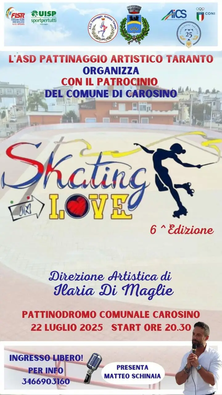 Si rinnova uno degli appuntamenti più attesi dell’estate sportiva e artistica tarantina: lunedì 22 luglio 2025, a partire dalle ore 20:30, il Pattinodromo Comunale di Carosino ospiterà la sesta edizione di Skating in Love, spettacolo di pattinaggio artistico promosso dall’ASD Pattinaggio Artistico Taranto, con il patrocinio del Comune di Carosino.
