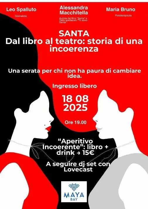 Taranto – Un incontro tra letteratura, teatro e psicologia, immerso nella cornice suggestiva del mare al tramonto. Lunedì 18 agosto, a partire dalle ore 19.00, il Lido Maya Bay (Torre Sgarràta, Torretta Mare, TA) ospita “SANTA – Dal libro al teatro: storia di una incoerenza”, un evento pensato per chi non ha paura di cambiare idea.
