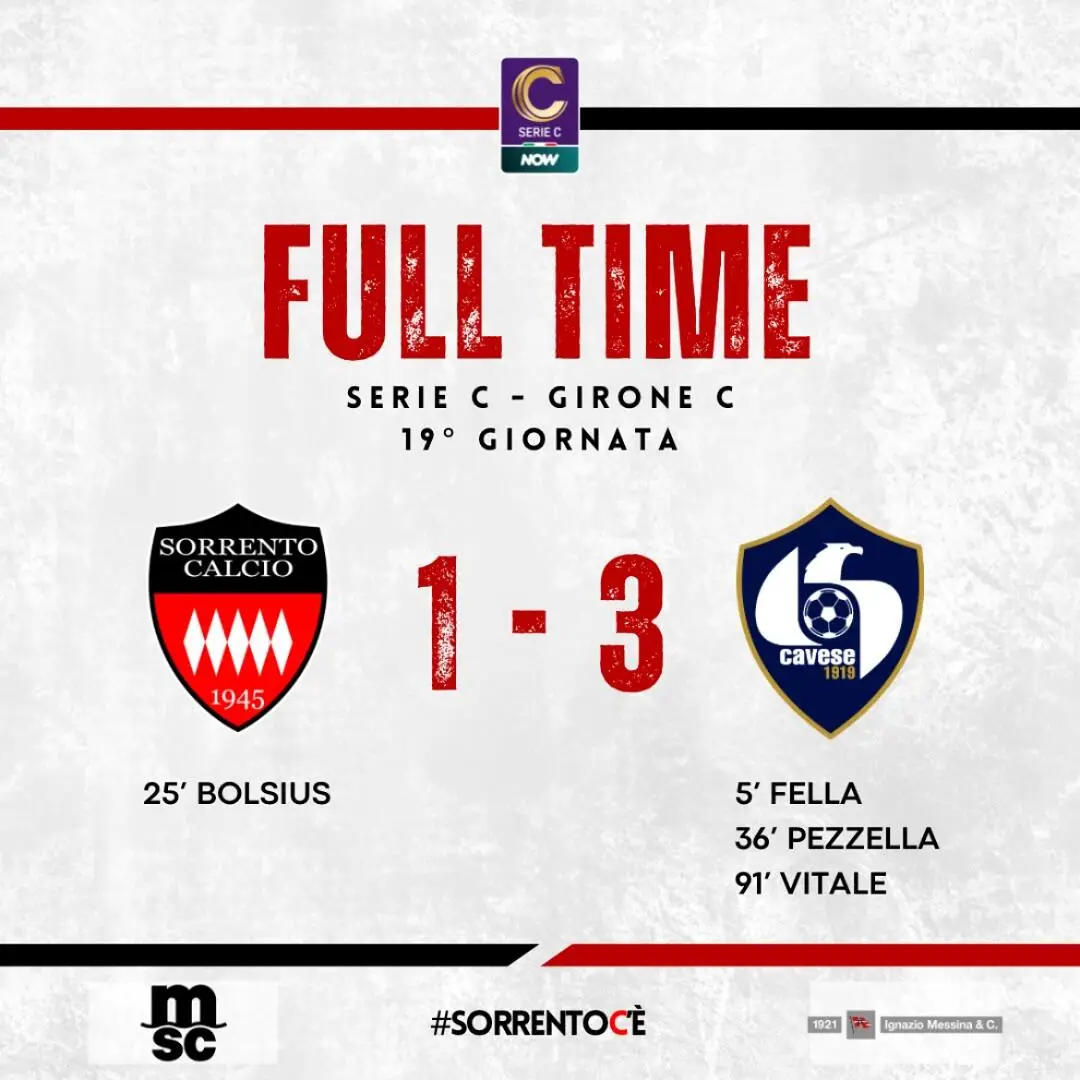 Reti: al 25' pt Bolsius D. (Sorrento) al 5' pt Fella G. (Cavese) , al 36' pt Pezzella S. (Cavese) , al 45'+1 st Vitale G. (Cavese) .