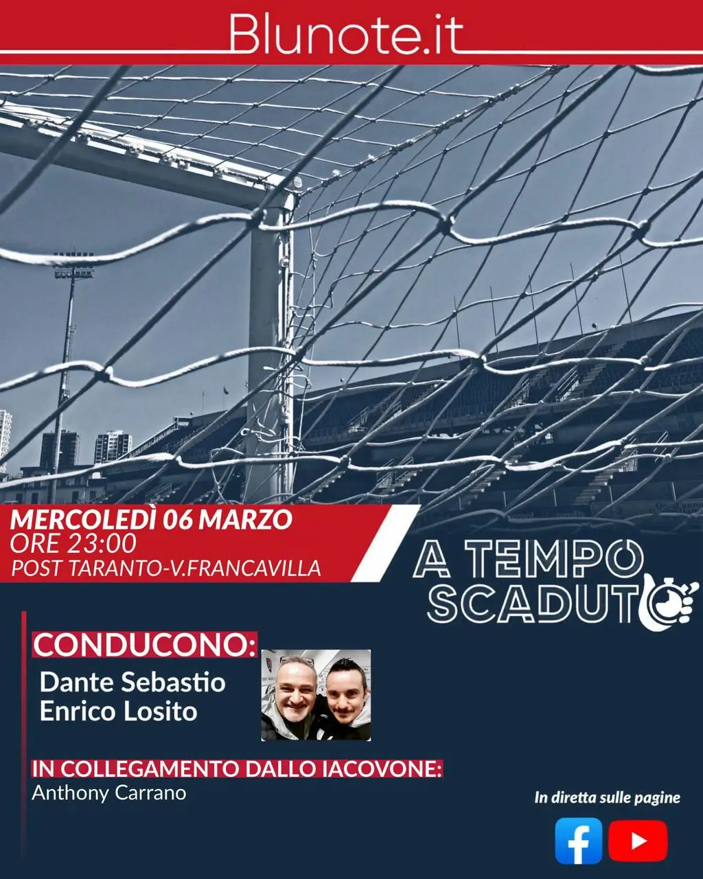 Mercoledì 6 marzo dalle ore 23:00, appuntamento con “A TEMPO SCADUTO”, il contenitore sportivo a cura della redazione di Blunote.it condotto da Dante Sebastio ed Enrico Losito. Commenteremo insieme la gara Taranto-Virtus Francavilla, in collegamento dallo Stadio E. Iacovone ci sarà il nostro Anthony Carrano che raccoglierà le dichiarazioni dei protagonisti nel dopo gara. Vi aspettiamo in diretta sulle pagine ufficiali Facebook e Youtube di Blunote Web dalle ore 20:30! Il contenitore sportivo è stato realizzato grazie al supporto di Hotel Virgilio in Viale Virgilio, 4 a Taranto; Ipersport in via per S. Giorgio Jonico km 10 (contrada Cimino) a Taranto; Elettrica Martino in Via De Cesare, 8/10 a Taranto; Studio Radiologico San Tommaso in via Luigi Settembrini, 232 a Talsano (TA); Teatro Cinema Orfeo in via Pitagora, 98 a Taranto; Studio Fornaro-Occhinegro dottori commercialisti associati, in Piazzale Dante, 8 a Taranto; in via Skanderbeg, 64 a Bari e in via Einaudi, 10 a Locorotondo (BA); Studio Dentistico Sannelli Dr. Vito e Fabio Sannelli in viale Magna Grecia, 20 a Taranto, Ottica Dierre in Corso Italia, 329/331 a Taranto; Farmacia Galantino di Mauro e Carla in via Medaglie D’Oro, 19 a Taranto; CAFFE FADI, Coffee World by Coffee Break in via Dante Alighieri, 283 a Taranto e Onoranze Funebri “GLI ANGELI s.r.l.” H24 Attolino in via Monfalcone, 17 e in via C. Battisti, 90 a Taranto e in via V. Emanuele, 31/A a Leporano.