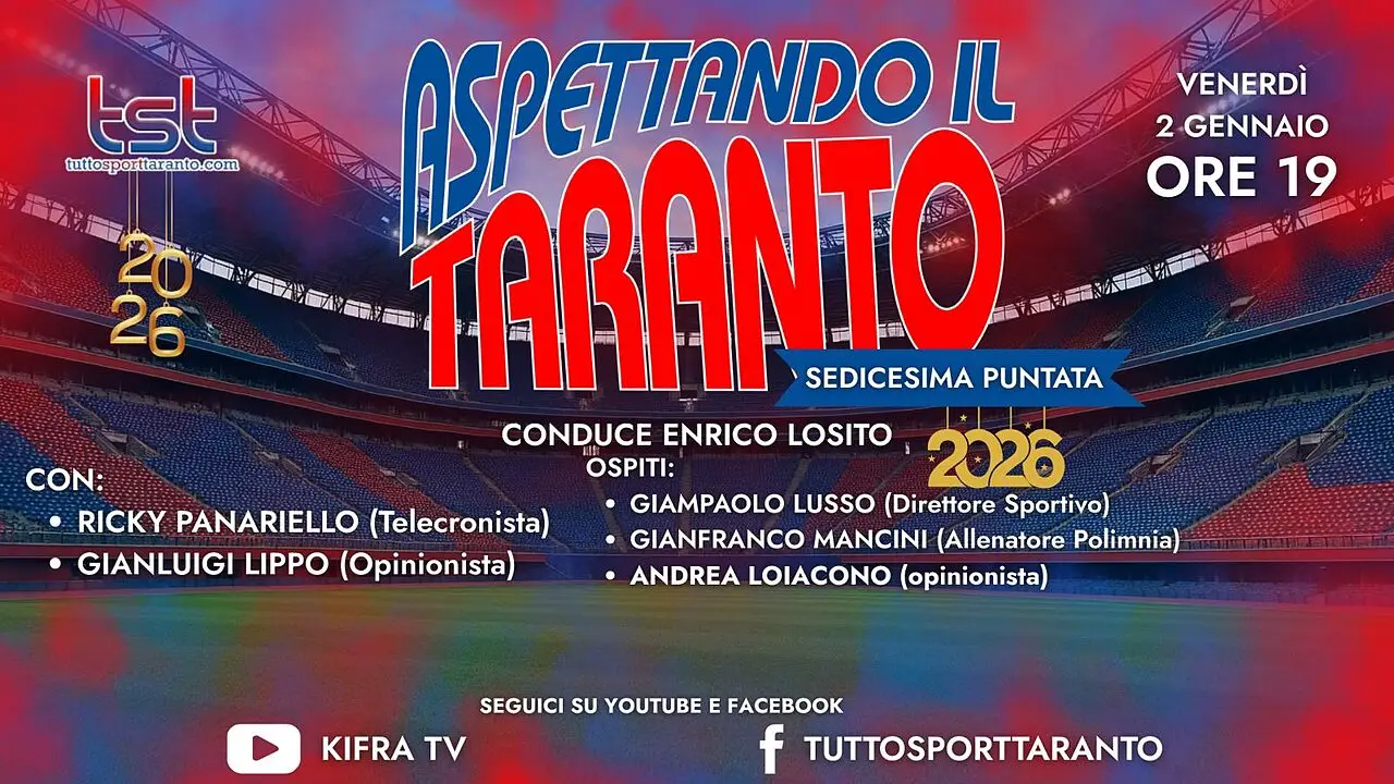 Venerdì 2 gennaio dalle ore 19:00 in diretta dagli studi di Ki.fra Tv andrà in onda “ASPETTANDO IL TARANTO”, il contenitore sportivo a cura della redazione di Tutto Sport Taranto.com condotto da Enrico Losito, coadiuvato dal telecronista Ricky Panariello e dall’opinionista Gianluigi Lippo con la regia di Claudio Ingrosso. Nel corso della puntata tratteremo le tematiche di stretta attualità della SS Taranto Calcio proiettandoci alla prossima sfida in campionato contro il Polimnia Calcio. Ospite in studio in qualità di opinionista Andrea Loiacono mentre in collegamento esterno ci saranno Giampaolo Lusso, direttore sportivo e Gianfranco Mancini, allenatore della Polimnia. Vi aspettiamo in diretta sulle pagine ufficiali Facebook, Youtube e Twitch di Tutto Sport Taranto e Ki.fra tv dalle ore 19:00 con le vostre domande, commenti e opinioni…NON MANCATE!!! Il contenitore sportivo è stato realizzato grazie al supporto di Studio Fornaro-Occhinegro dottori commercialisti associati, in Piazzale Dante, 8 a Taranto; in via Skanderbeg, 64 a Bari e in via Einaudi, 10 a Locorotondo (BA); Erario Ottavio Srls – Costruzioni edilizie in via Don Minzoni, 2 a Manduria (TA); 101 Desideri Floreali, Via Lama, 120 a Lama (TA) cell. 389/5245740; Hotel Virgilio "Una Terrazza sul Mare " Viale Virgilio, 4 a Taranto tel. 099/4594116; Nolocar Srls , via Galeso, 355 a Taranto cell. 346/5075088; Headway Travel di Ascoli Annunziata, Piazza Vittorio Veneto, 3 a Palagiano (TA) tel. 099/6528083; Auto Zentrum Rent Car by Giuliani, sede di Mottola, via C.A.Dalla Chiesa, s.n.c.,tel.099/8051329; cell.388/4456544; 328/6130332; sede di Gioia del Colle via Giulio Pastore, 78; tel. 080/4729201; cell. 328/6130332. .