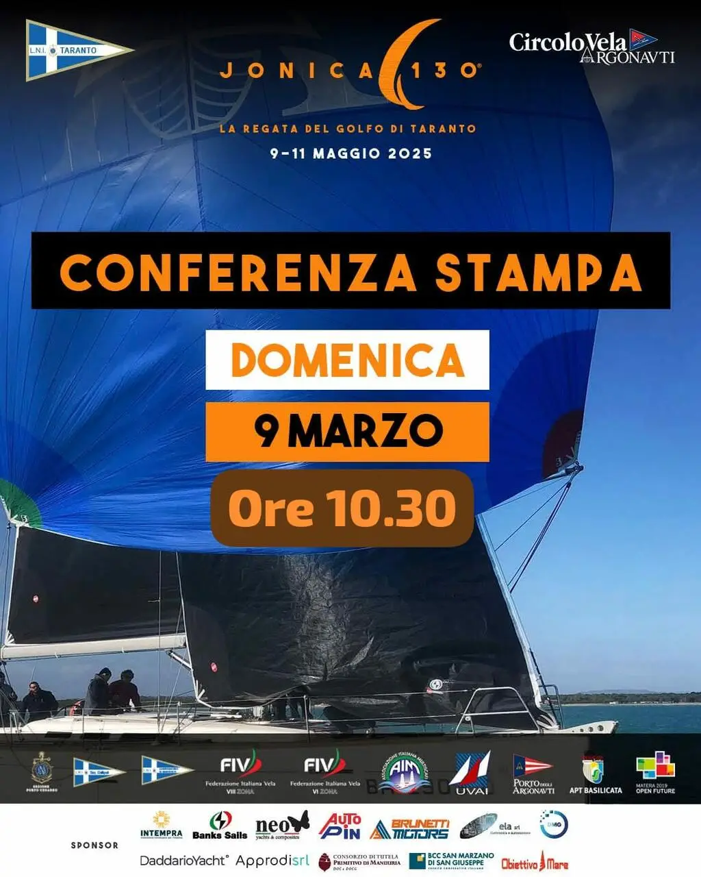 Si svolgerà domenica 9 marzo (con inizio alle ore 10:30) presso la sede della Lega Navale Italiana Sezione di Taranto (situata sul Lungomare Vittorio Emanuele III, 2) la conferenza stampa di presentazione della regata velica d'Altura "Jonica 130", un evento riconosciuto di livello Nazionale dalle Federazioni di appartenenza, per imbarcazioni d'altura, che si terrà dal 9 all’ 11 maggio tra Puglia e Basilicata.