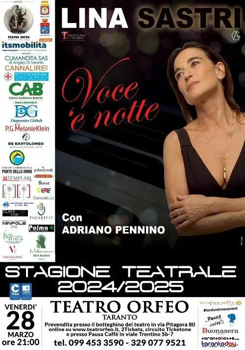 Venerdì 28 marzo, alle ore 21:00, il Teatro Orfeo di Taranto accoglierà il ritorno di una delle voci più affascinanti della scena italiana, Lina Sastri. L’artista, attrice e cantante vincitrice di tre David di Donatello, sarà protagonista dello spettacolo “Voce ‘e notte”, accompagnata dal musicista e direttore d’orchestra Adriano Pennino.
