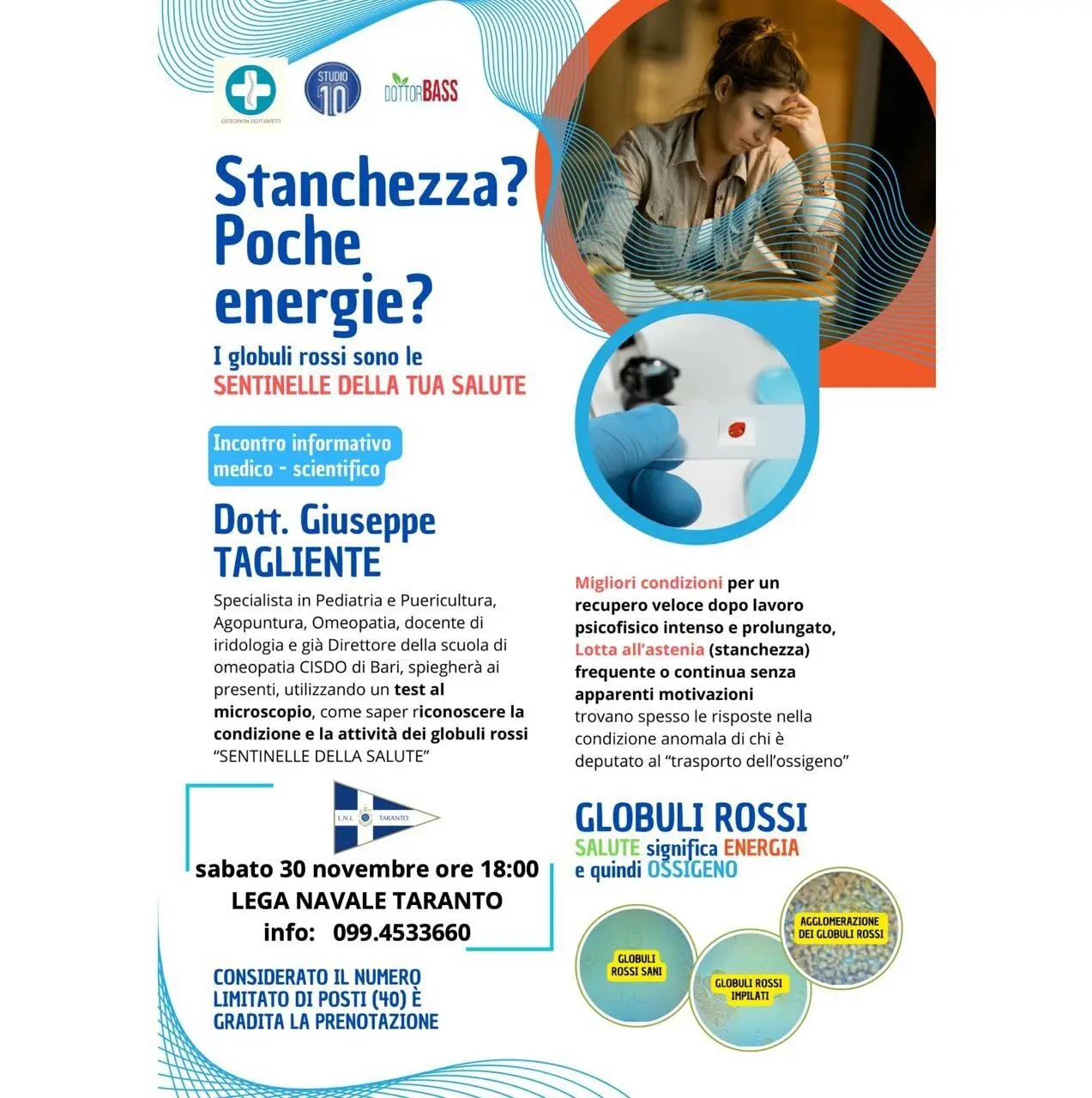 Sabato 30 novembre con inizio alle ore 18:00 presso la sede della Lega Navale Italiana Sezione di Taranto (sita a Taranto sul Lungomare V. Emanuele III, n.2) si svolgerà un incontro informativo medico - scientifico con il Dott. Giuseppe Tagliente , specialista in pediatria e puericultura, agopuntura, omeopatia, docente di iridologia e già direttore della scuola di omeopatia CISDO di Bari. Il dott. Tagliente spiegherà ai presenti, utilizzando un test al microscopio, come imparare a riconoscere la condizione e l'attività dei globuli rossi "sentinelle della salute". Le migliori condizioni per un recupero veloce dopo lavoro psicofisico intenso e prolungato, lotta all'astenia (stanchezza) frequente o continua senza apparenti motivazioni trovano spesso le risposte nella condizione anomala di chi è deputato al trasporto dell'ossigeno. Tra gli obiettivi del dott. Tagliente, quello della diffusione culturale, finalizzata a migliorare il senso critico nella popolazione per difendere il benessere psicofisico. Le società sportive possono essere ulteriore veicolo informativo per una migliore “qualità della salute”.