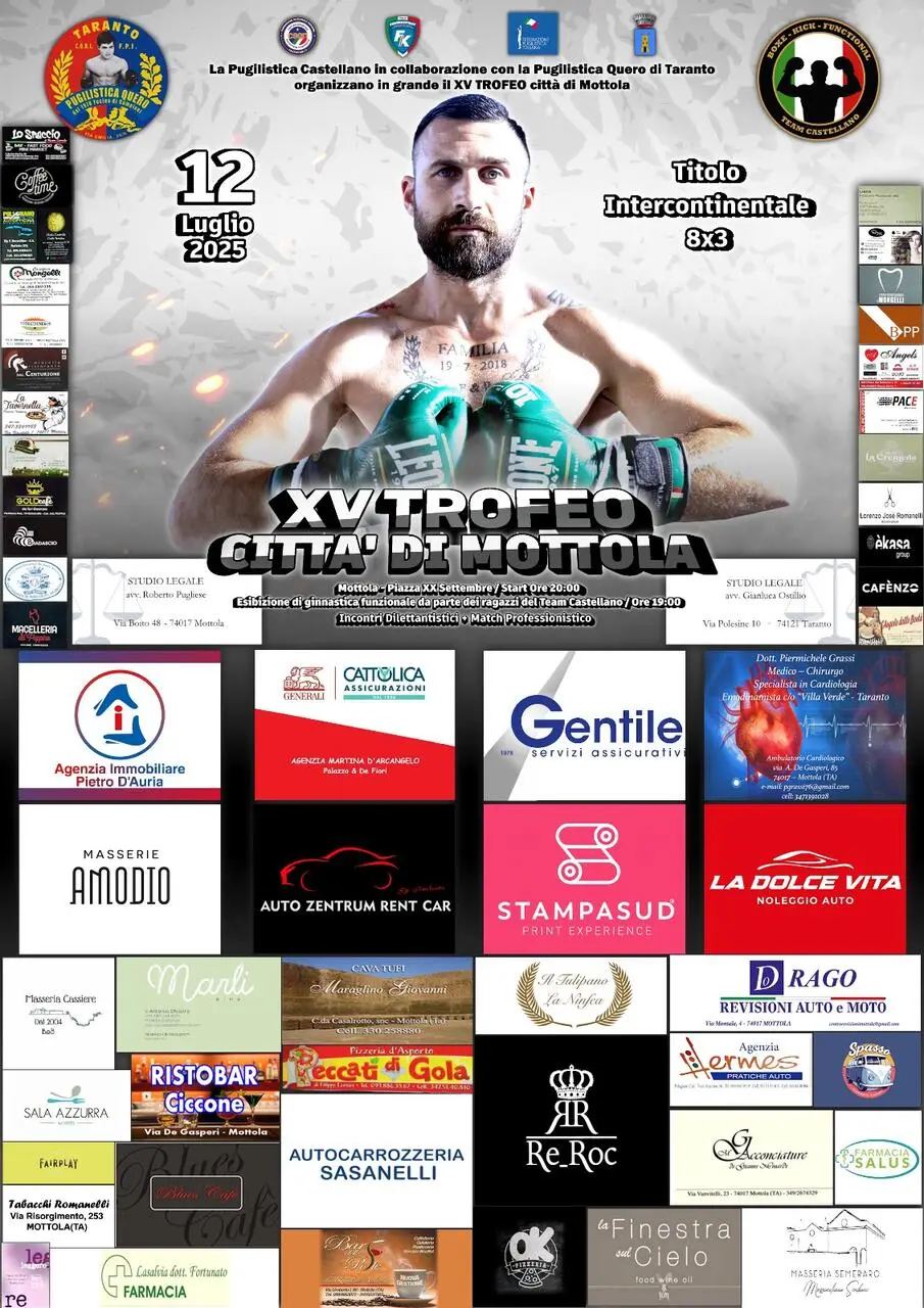 La centralissima piazza XX settembre si accenderà questo sabato 12 luglio alle ore 19.30 con la boxe sinergica delle società pugilistiche Castellano e Quero, in co-organizzazione per la quindicesima edizione del Trofeo Città di Mottola, la manifestazione sportiva che ha avuto vita per la prima volta nell'ormai lontano anno 2000 e che torna in una delle piazze che le hanno dato maggior splendore.