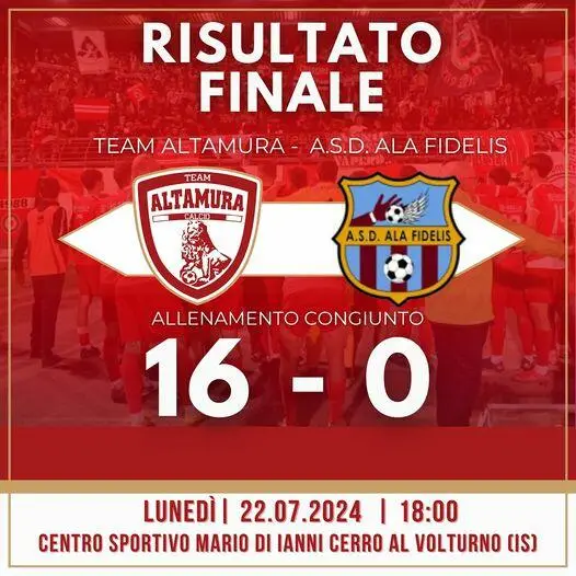 Si conclude con il risultato di 16-0 il primo test stagionale del Team Altamura targato Di Donato. Un test che serve a mettere benzina nelle gambe in questa fase della stagione interamente dedicata alla preparazione atletica.