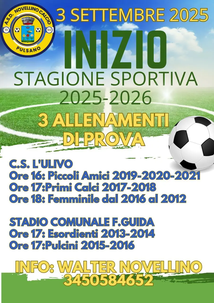 In casa ASD Novellino Calcio Pulsano si va sempre più verso l'inizio ufficiale della stagione 2025-26. Per tanto la rinomata e storica società della famiglia Novellino organizza tre allenamenti di prova gratuiti. Al Centro Sportivo 'L'Ulivo' dal 3 settembre, giorno di inizio della preparazione per queste categorie, potranno provare alle ore 16 i Piccoli Amici 2019, 2020 e 2021, alle ore 17 i Primi Calci 2017 e 2018 e alle ore 18 le bambine nate dal 2012 al 2017. Prove anche allo Stadio Comunale "Guida" dove sono attesi alle ore 17 gli Esordienti 2013 e 2014 e, sempre alla stessa ora, i Pulcini 2015 e 2016.