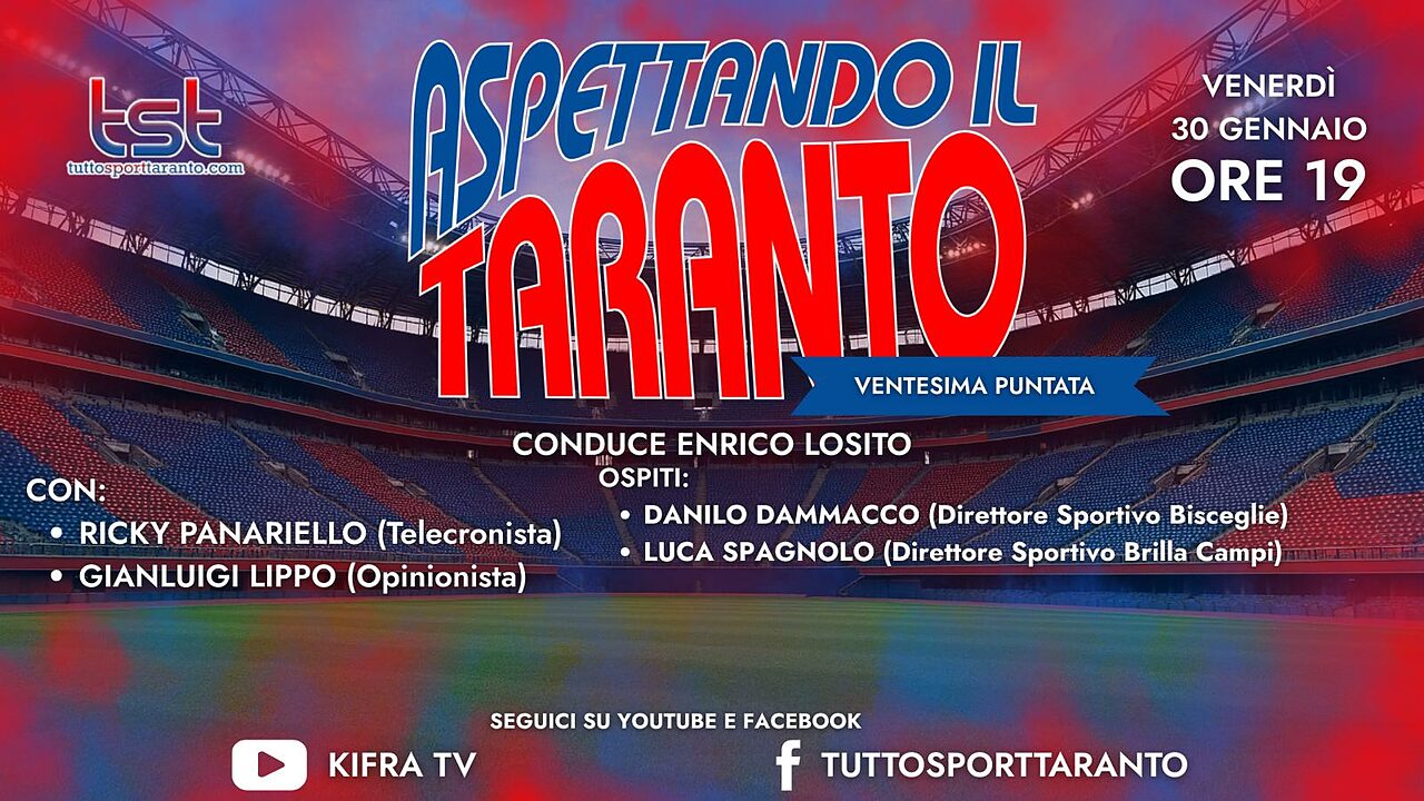 Venerdì 30 gennaio dalle ore 19:00 in diretta dagli studi di Ki.fra Tv andrà in onda “ASPETTANDO IL TARANTO”, il contenitore sportivo a cura della redazione di Tutto Sport Taranto.com condotto da Enrico Losito, coadiuvato dal telecronista Ricky Panariello e dall’opinionista Gianluigi Lippo con la regia di Claudio Ingrosso. Nel corso della puntata tratteremo le tematiche di stretta attualità della SS Taranto Calcio soffermandoci sulla gara in campionato contro il Bitonto e soprattutto proiettandoci sulla finale di Coppa Italia di Eccellenza Pugliese contro il Bisceglie e sulla gara casalinga in campionato con il Brilla Campi. Tra gli ospiti: Danilo Dammacco, direttore sportivo del Bisceglie, e Luca Spagnolo, direttore sportivo del Brilla Campi. Vi aspettiamo in diretta sulle pagine ufficiali Facebook, Youtube e Twitch di Tutto Sport Taranto e Ki.fra tv dalle ore 19:00 con le vostre domande, commenti e opinioni…NON MANCATE!!! Il contenitore sportivo è stato realizzato grazie al supporto di Studio Fornaro-Occhinegro dottori commercialisti associati, in Piazzale Dante, 8 a Taranto; in via Skanderbeg, 64 a Bari e in via Einaudi, 10 a Locorotondo (BA); Erario Ottavio Srls – Costruzioni edilizie in via Don Minzoni, 2 a Manduria (TA); 101 Desideri Floreali, Via Lama, 120 a Lama (TA) cell. 389/5245740; Hotel Virgilio "Una Terrazza sul Mare " Viale Virgilio, 4 a Taranto tel. 099/4594116; Nolocar Srls , via Galeso, 355 a Taranto cell. 346/5075088; Headway Travel di Ascoli Annunziata, Piazza Vittorio Veneto, 3 a Palagiano (TA) tel. 099/6528083; Auto Zentrum Rent Car by Giuliani, sede di Mottola, via C.A.Dalla Chiesa, s.n.c.,tel.099/8051329; cell.388/4456544; 328/6130332; sede di Gioia del Colle via Giulio Pastore, 78; tel. 080/4729201; cell. 328/6130332.