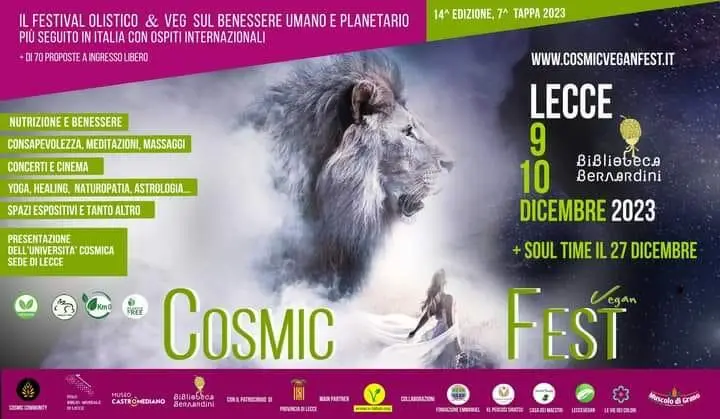 Dopo un lungo tour che ha visto la 14^ edizione del Cosmic Vegan Fest colma di ospiti di rilevanza nazionale come la cantante Antonella Ruggiero, l’attrice televisiva e teatrale Daniela Poggi, il musicista Yari Carrisi Power, il doppiatore e attore Massimo Wertmuller, la scrittrice-tarottista Marianne Costa, il giornalista della Rai Alberto Lori e tanti altri; il Festival del Benessere giunge a Lecce presso la Biblioteca Bernardini/Convitto Palmieri sabato 9 e  domenica 10 dicembre 2023 con una programmazione ricchissima di appuntamenti con circa 70 proposte che i visitatori potranno gustare tra conferenze, seminari, trattamenti individuali con operatori olistici specializzati provenienti da tutta la Puglia. Il festival mira a promuovere da anni un settore inizialmente sconosciuto a molti e lo fa coinvolgendo professionisti, gruppi e artisti. Il Cosmic Vegan è prodotto da Cosmic Community,  con il partner Polo BiblioMuseale di Lecce che ospita l’evento negli spazi della Biblioteca Bernardini e nella Ex Chiesa San Francesco della Scarpa grazie alla collaborazione della Provincia di Lecce e con il patrocinio della Città di Lecce . Main Partner del festival il marchio di certificazione internazionale Vegan V-label Italia. La maggior parte delle iniziative sono gratuite con un eventuale contributo libero. Il Festival del benessere Cosmic Vegan Fest è nato 12 anni fa ed ha realizzato sino ad ora circa  20 tappe di successo frequentate da un pubblico variegato fatto di giovani e adulti, soprattutto nel Salento. Il gruppo ha avuto anche il piacere di portare i suoi messaggi a Matera per due edizioni e addirittura in  Argentina. Da quest’anno nuovo exploit con un tour, il cui marchio è “Il Leone di Fuoco” dedicato al coraggio insito in ognuno di noi nel percorrere la vita. “Quando si arriva al Cosmic si respira una magia particolare, perché la manifestazione è il frutto di un intento puro del cuore: un dono a questa dimensione terrestre per raggiungere uno status di relazione  più armonica con tutto l’esistente fatto di esseri umani, vegetali, terra, aria. Il festival è nato dal basso ed è il frutto della collaborazione tra diverse persone, realtà ed enti che mettono a disposizione gli spazi, e  che in ogni appuntamento si riuniscono per festeggiare una vita sana, meno consumistica e più in contatto con gli elementi naturali.”