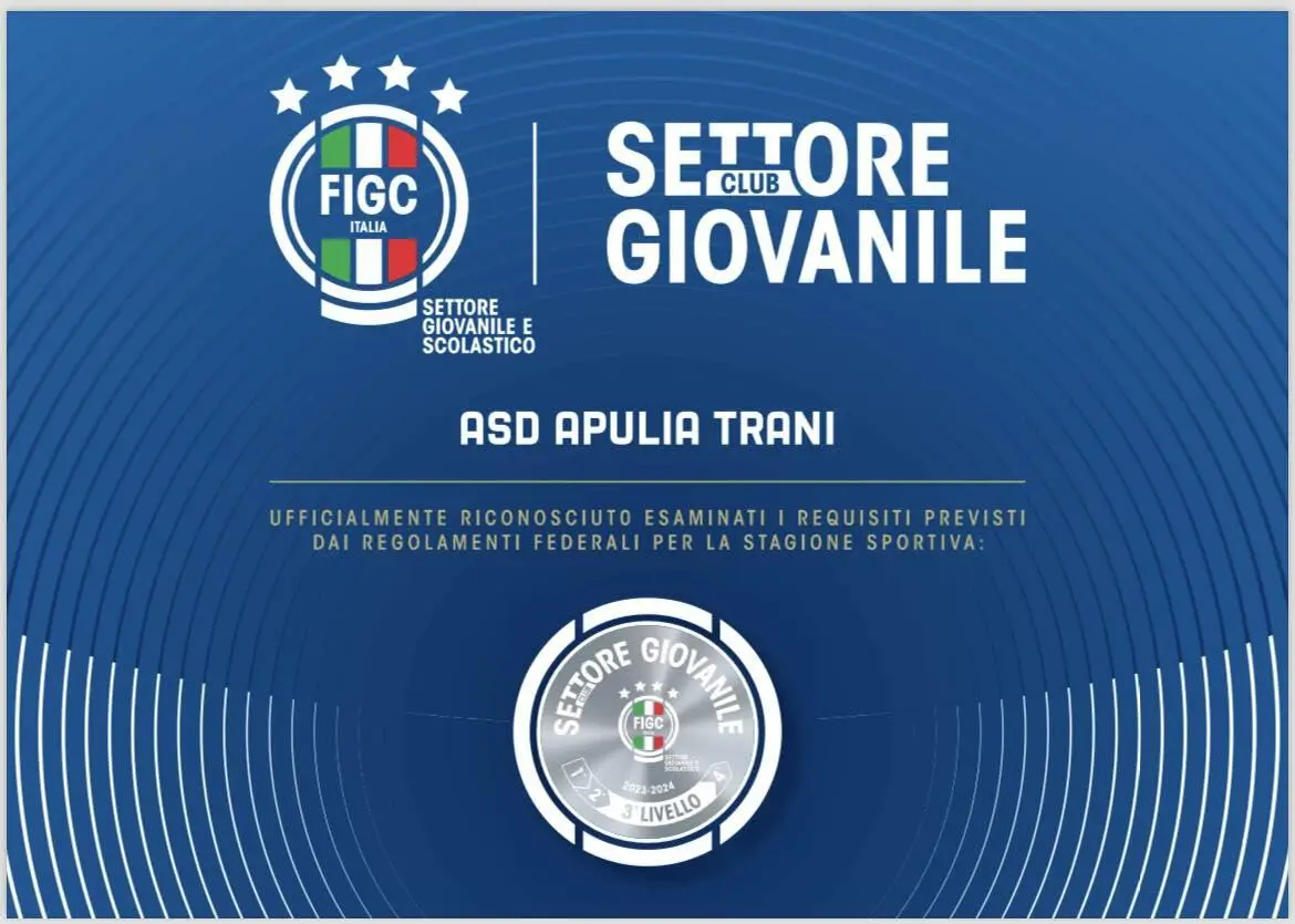 Ancora grandi soddisfazioni frutto del lavoro, della serietà e della dedizione di tutto lo staff per l’Apulia Trani che ottiene il riconoscimento, per la stagione 2023-24, di Settore Giovanile di Terzo Livello.