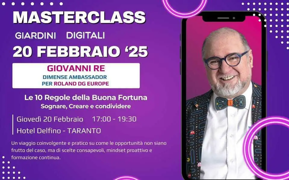 Re sarà protagonista della quarta Masterclass di Giardini Digitali, progetto a cura del CIOFS/FP-Puglia ETS e dalle associazioni: SurfHERS APS, Visonari ETS/APS e Stella Marina APS, che gode del patrocinio di Confindustria Taranto. L'incontro si terrà giovedì 20 febbraio 2025 all'Hotel Delfino di Taranto dalle ore 17.00 alle ore 19.30. Nella sua relazione Re guiderà un percorso ispirazionale su come la fortuna non sia un caso, ma il risultato di scelte consapevoli, competenze e mentalità vincente. Illustrerà le sue famose 10 Regole della Buona Fortuna, evidenziando alcuni concetti chiave della crescita professionale: come creare opportunità anziché aspettarle, l’importanza della formazione continua per attrarre il lavoro, strategie per sviluppare competenze e restare competitivi nel mercato digitale, la mentalità giusta per affrontare sfide e cambiamenti.