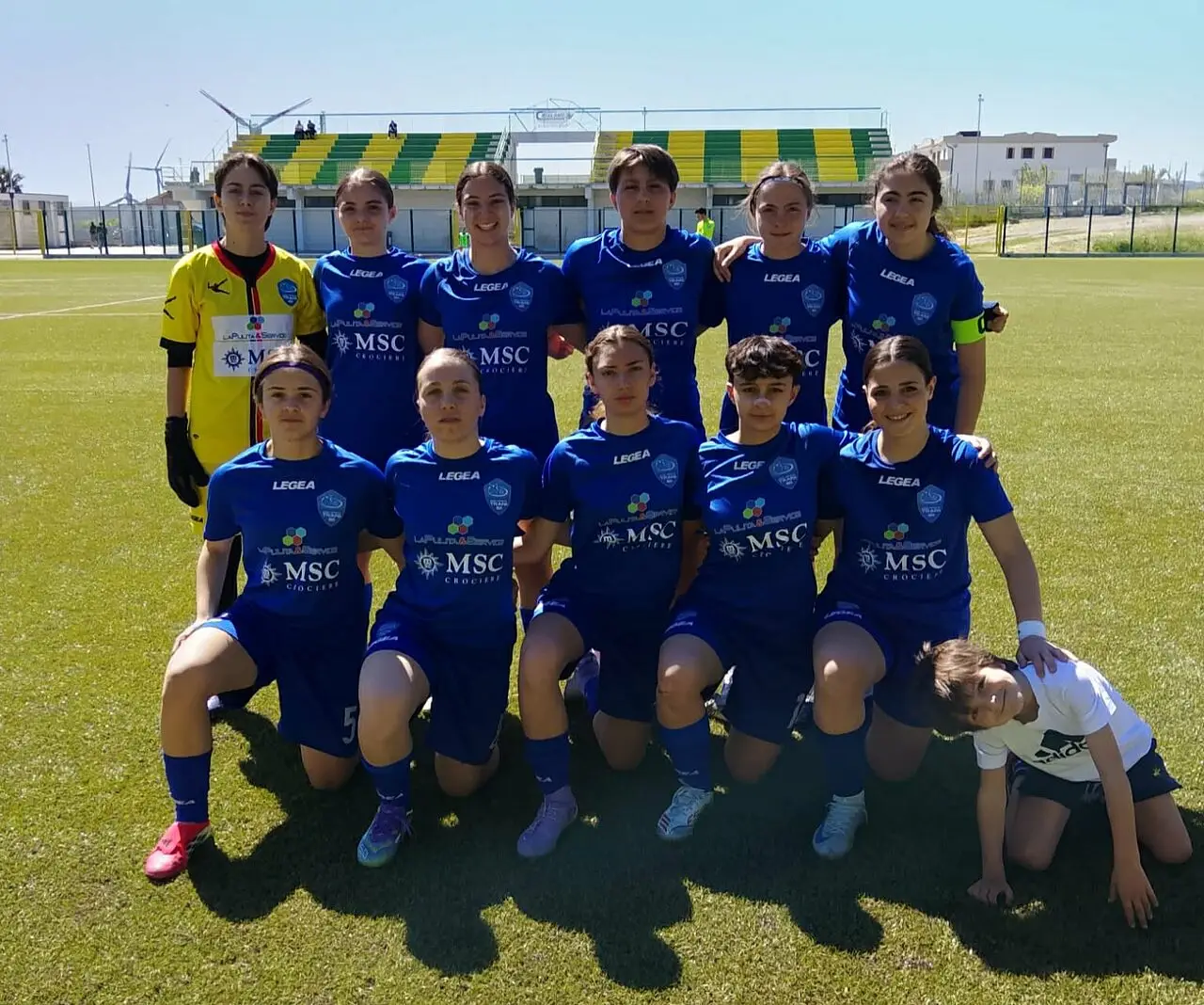 Ancora una grandissima giornata per l’U17 dell’Apulia Trani che sabato ha battuto nettamente e giocando anche un buon calcio il Foggia per 0-7. Le biancoazzurre si fanno nettamente avanti già nella prima frazione tanto che all’intervallo sono già sopra di tre gol grazie alle segnature di Franklin (due gol) e di Porcelluzzi. Nella ripresa la formazione tranese dilaga trovando altre quattro marcature ancora con Franklin che completa la sua personale tripletta, con Rosanna Fiore autrice di una doppietta e poi con Pappalettera e Porcelluzzi (come detto)