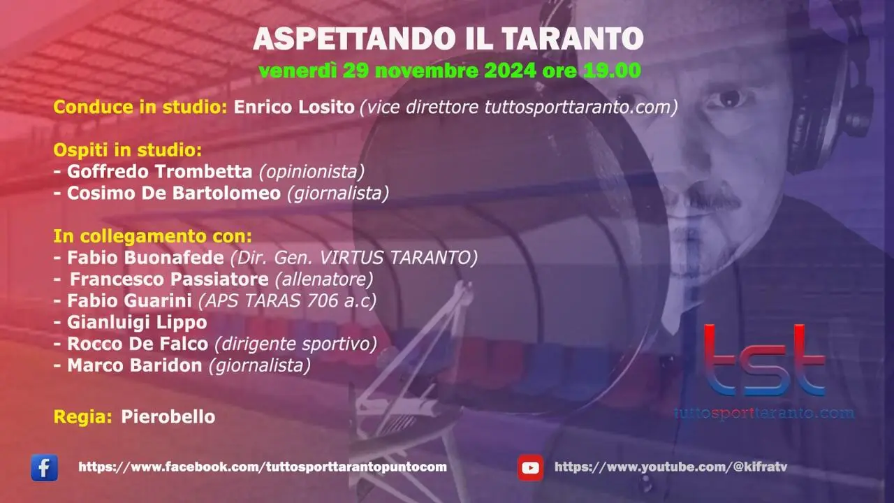 Venerdì 29 novembre dalle ore 19:00, appuntamento con “ASPETTANDO IL TARANTO”, il contenitore sportivo a cura della redazione di Tutto Sport Taranto.com condotto da Enrico Losito con la regia di Piero Bello. Nel corso della puntata tratteremo le tematiche di stretta attualità del Taranto Fc 1927 in particolare della cessione societaria della sconfitta dei rossoblu allo Iacovone contro il Benevento proiettandoci verso la gara Juve Next Gen-Taranto. Dagli studi della nostra redazione di Ki.Fra Tv avremo come ospit della puntata: il nostro opinionista Goffredo Trombetta e il giornalista Cosimo De Bartolomeo mentre in collegamento esterno ci saranno: l’allenatore Francesco Passiatore; il nostro Gianluigi Lippo; Fabio Guarini dell’APS Taras 706 a.C., Fabio Buonafede, direttore generale della Virtus Taranto, il dirigente sportivo Rocco De Falco (ex team manager di Turris e Giuliano) da Torino Marco Bardinon, giornalista di Juvenews 24. Vi aspettiamo in diretta sulle pagine ufficiali Facebook e Youtube di Tutto Sport Taranto e Ki.fra tv dalle ore 19:00 con le vostre domande, commenti e opinioni…NON MANCATE!!! Il contenitore sportivo è stato realizzato grazie al supporto di Ipersport in via per S. Giorgio Jonico km 10 (contrada Cimino) a Taranto; Studio Radiologico San Tommaso in via Luigi Settembrini, 232 a Talsano (TA); Studio Fornaro-Occhinegro dottori commercialisti associati, in Piazzale Dante, 8 a Taranto; in via Skanderbeg, 64 a Bari e in via Einaudi, 10 a Locorotondo (BA); Ottica Dierre in Corso Italia, 329/331 a Taranto; Birroteca Puglia in via Cataldo Nitti, 14 a Taranto; Erario Ottavio Srls – Costruzioni edilizie in via Don Minzoni, 2 a Manduria (TA), Guernica - cucina pizzeria tarantina in via Acclavio, 4-10 a Taranto, Peperoncino Rosso Trattoria, via S. Francesco 13/b a Statte (TA).