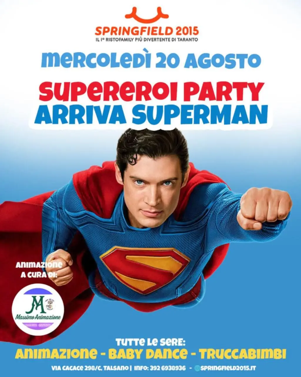 Un nuovo personaggio dell'Associazione Giò Giò e i Supereroi sta per atterrare su Springfield 2015. Mercoledì 20 agosto a far divertire i presenti ci dovrà pensare Superman che animerà parte della serata dando, come sempre, l'opportunità a grandi e piccini di scattare foto. Non mancate!