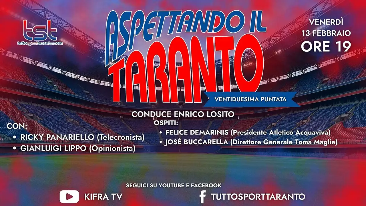 Venerdì 13 febbraio dalle ore 19:00 in diretta dagli studi di Ki.fra Tv andrà in onda “ASPETTANDO IL TARANTO”, il contenitore sportivo a cura della redazione di Tutto Sport Taranto.com condotto da Enrico Losito, coadiuvato dal telecronista Ricky Panariello e dall’opinionista Gianluigi Lippo con la regia di Claudio Ingrosso. Nel corso della puntata tratteremo le tematiche di stretta attualità della SS Taranto Calcio soffermandoci sulla gara in campionato contro l’Ugento e proiettandoci sulla prossime gare di campionato con l’Atletico Acquaviva in casa e il Toma Maglie in trasferta. Ospite della puntata in collegamento: Felice Demarinis, presidente dell’Atletico Acquaviva e Josè Buccarella, direttore generale del Toma Maglie. Vi aspettiamo in diretta sulle pagine ufficiali Facebook, Youtube e Twitch di Tutto Sport Taranto e Ki.fra tv dalle ore 19:00 con le vostre domande, commenti e opinioni…NON MANCATE!!! Il contenitore sportivo è stato realizzato grazie al supporto di Studio Fornaro-Occhinegro dottori commercialisti associati, in Piazzale Dante, 8 a Taranto; in via Skanderbeg, 64 a Bari e in via Einaudi, 10 a Locorotondo (BA); Erario Ottavio Srls – Costruzioni edilizie in via Don Minzoni, 2 a Manduria (TA); 101 Desideri Floreali, Via Lama, 120 a Lama (TA) cell. 389/5245740; Hotel Virgilio "Una Terrazza sul Mare " Viale Virgilio, 4 a Taranto tel. 099/4594116; Nolocar Srls , via Galeso, 355 a Taranto cell. 346/5075088; Headway Travel di Ascoli Annunziata, Piazza Vittorio Veneto, 3 a Palagiano (TA) tel. 099/6528083; Auto Zentrum Rent Car by Giuliani, sede di Mottola, via C.A.Dalla Chiesa, s.n.c.,tel.099/8051329; cell.388/4456544; 328/6130332; sede di Gioia del Colle via Giulio Pastore, 78; tel. 080/4729201; cell. 328/6130332. .