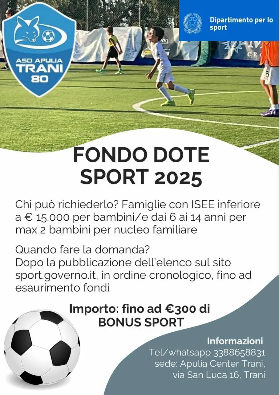 Subito grandi novità in casa Apulia Trani con la storica società biancoazzurra che comunica di aver regolarmente presentato la domanda per l'adesione al bonus sport con la pubblicazione degli aventi diritto che sarà presentata nei prossimi giorni con le famiglie degli iscritti che dopo questa, potranno accedere all'importante contributo sportivo (300 euro) che rappresenta un'altra importante occasione di crescita sportiva ed educativa per i tutti i bambini.