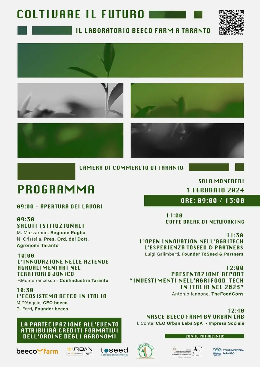 All’interno di questa macroarea si inserisce il convegno: “ COLTIVARE IL FUTURO IL LABORATORIO BEECO FARM A TARANTO”, promosso da Urban Labs , che si terrà giovedì 1 febbraio 2024 dalle ore 9.00 alle ore 13.00 presso la Sala Monfredi della Camera di Commercio di Taranto.