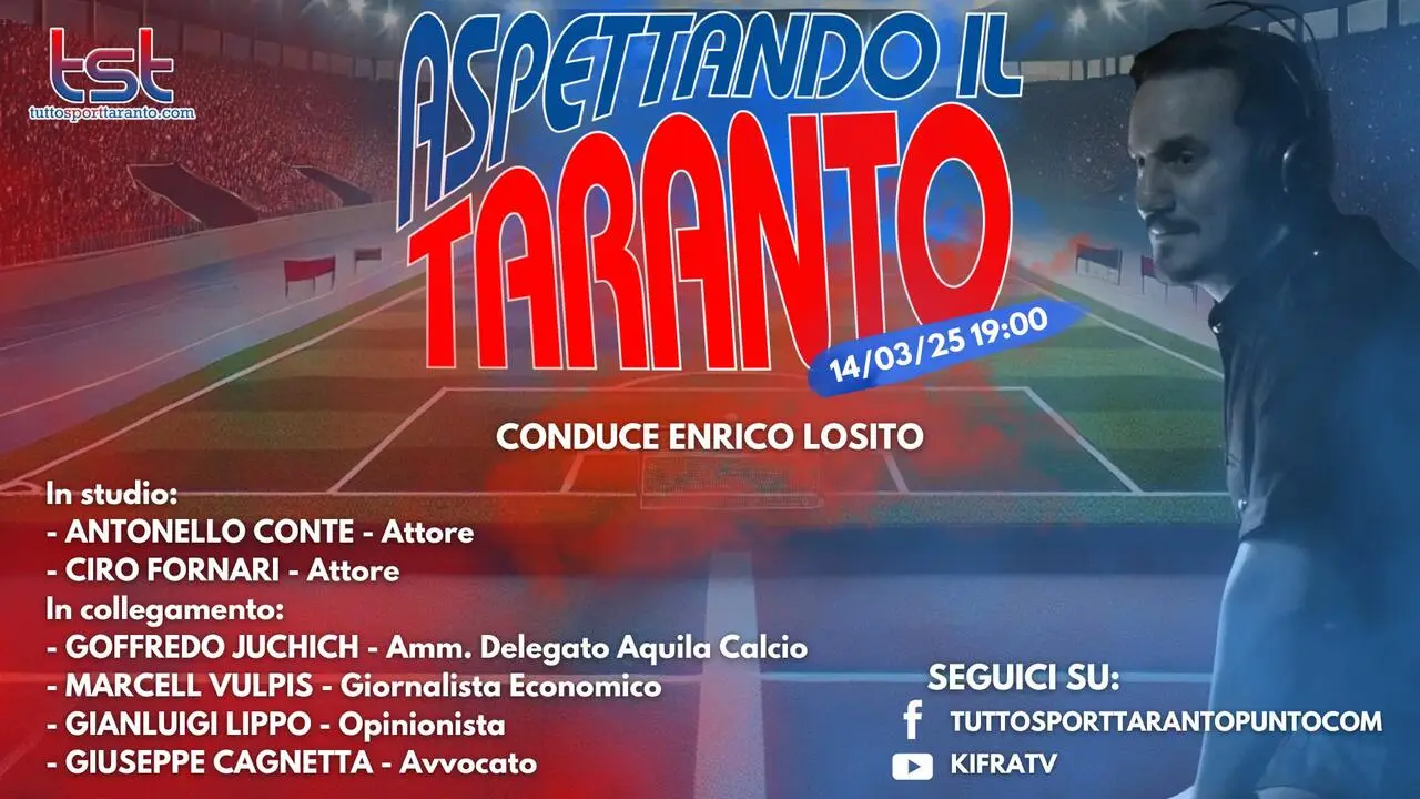 Venerdì 14 marzo dalle ore 19:00 in diretta dagli studi di Ki.fra Tv nuovo appuntamento con “ ASPETTANDO IL TARANTO ”, il contenitore sportivo a cura della redazione di Tutto Sport Taranto.com condotto da Enrico Losito con la regia di Claudio Ingrosso . Nel corso della puntata tratteremo le tematiche di stretta attualità del Taranto Fc 1927 e del progetto societario de L'Aquila 1927 che sarà descritto da Goffredo Juchich , amministratore delegato della società calcistica abruzzese. Ospiti in studio: gli attori teatrali Antonello Conte e Ciro Fornari che ci parleranno anche dello spettacolo “Che li hai Visti?”. Nel collegamento esterno ci saranno, oltre a Juchich, il giornalista economico Marcel Vulpis, l'avvocato Giuseppe Cagnetta e il nostro Gianluigi Lippo . Vi aspettiamo in diretta sulle pagine ufficiali Facebook e Youtube di Tutto Sport Taranto e Ki.fra tv dalle ore 19:00 con le vostre domande, commenti e opinioni…NON MANCATE!!! Il contenitore sportivo è stato realizzato grazie al supporto di Ipersport in via per S. Giorgio Jonico km 10 (contrada Cimino) a Taranto; Studio Radiologico San Tommaso in via Luigi Settembrini, 232 a Talsano (TA); Studio Fornaro-Occhinegro dottori commercialisti associati , in Piazzale Dante, 8 a Taranto; in via Skanderbeg, 64 a Bari e in via Einaudi, 10 a Locorotondo (BA); Ottica Dierre in Corso Italia, 329/331 a Taranto; Birroteca Puglia in via Cataldo Nitti, 14 a Taranto; Erario Ottavio Srls – Costruzioni edilizie in via Don Minzoni, 2 a Manduria (TA), Guernica - cucina pizzeria tarantina in via Acclavio, 4-10 a Taranto, Peperoncino Rosso Trattoria , via S. Francesco 13/ba Statte (TA), 101 Desideri Floreali , Via Lama, 120 a Lama (TA).