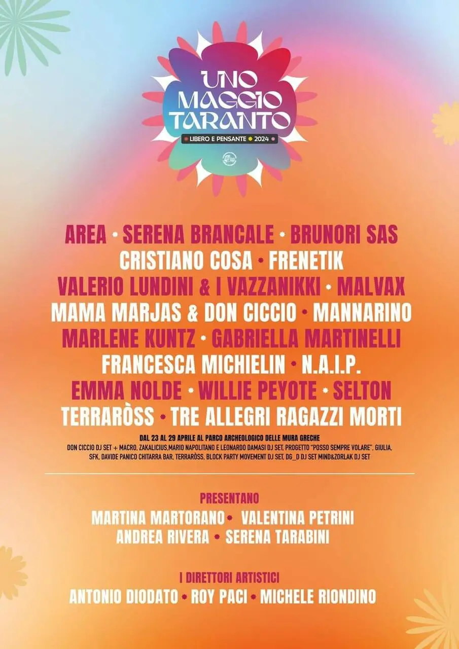 L'organizzazione dell'Uno Maggio Taranto Libero e Pensante ha ufficializzato i nomi degli artisti che si esibiranno il prossimo 1 Maggio al Parco Archeologico delle Mura Greche: