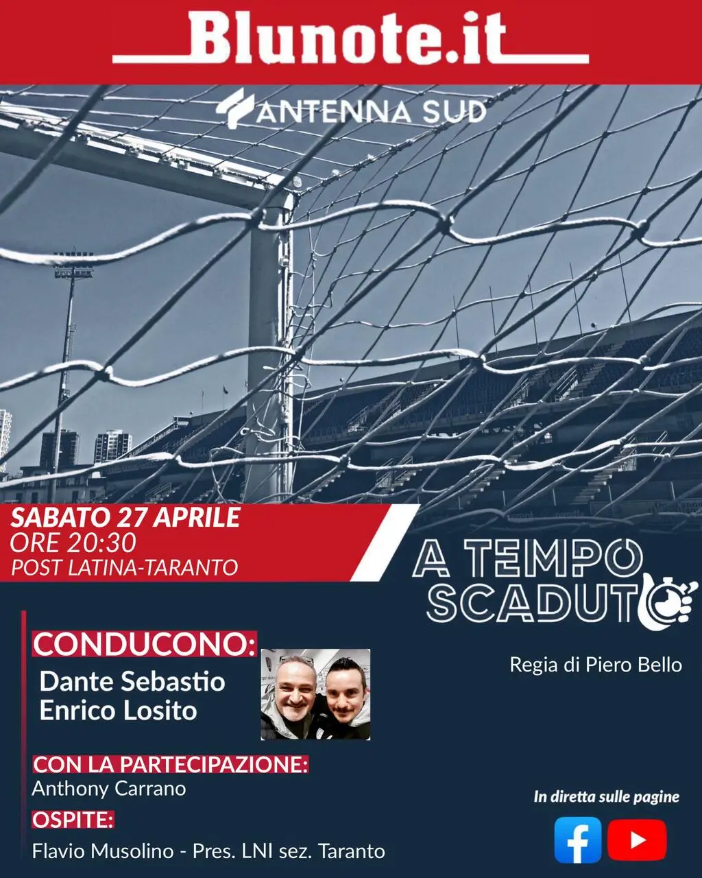 Sabato 27 aprile dalle ore 20:30, appuntamento con “A TEMPO SCADUTO”, il contenitore sportivo a cura della redazione di Blunote.it condotto da Dante Sebastio ed Enrico Losito con la partecipazione di Anthony Carrano. Commenteremo insieme ai vostri messaggi la gara Latina-Taranto per l’ultima giornata di campionato. Ospite della puntata: Flavio Musolino, presidente della Lega Navale Italiana sez. Taranto. Vi aspettiamo in diretta sulle pagine ufficiali Facebook e Youtube di Blunote Web dalle ore 22:00! Il contenitore sportivo è stato realizzato grazie al supporto di Hotel Virgilio in Viale Virgilio, 4 a Taranto; Ipersport in via per S. Giorgio Jonico km 10 (contrada Cimino) a Taranto; Elettrica Martino in Via De Cesare, 8/10 a Taranto; Studio Radiologico San Tommaso in via Luigi Settembrini, 232 a Talsano (TA); Teatro Cinema Orfeo in via Pitagora, 98 a Taranto; Studio Fornaro-Occhinegro dottori commercialisti associati, in Piazzale Dante, 8 a Taranto; in via Skanderbeg, 64 a Bari e in via Einaudi, 10 a Locorotondo (BA); Studio Dentistico Sannelli Dr. Vito e Fabio Sannelli in viale Magna Grecia, 20 a Taranto, Ottica Dierre in Corso Italia, 329/331 a Taranto; Farmacia Galantino di Mauro e Carla in via Medaglie D’Oro, 19 a Taranto; CAFFE FADI, Coffee World by Coffee Break in via Dante Alighieri, 283 a Taranto e Onoranze Funebri “GLI ANGELI s.r.l.” H24 Attolino in via Monfalcone, 17 e in via C. Battisti, 90 a Taranto e in via V. Emanuele, 31/A a Leporano.