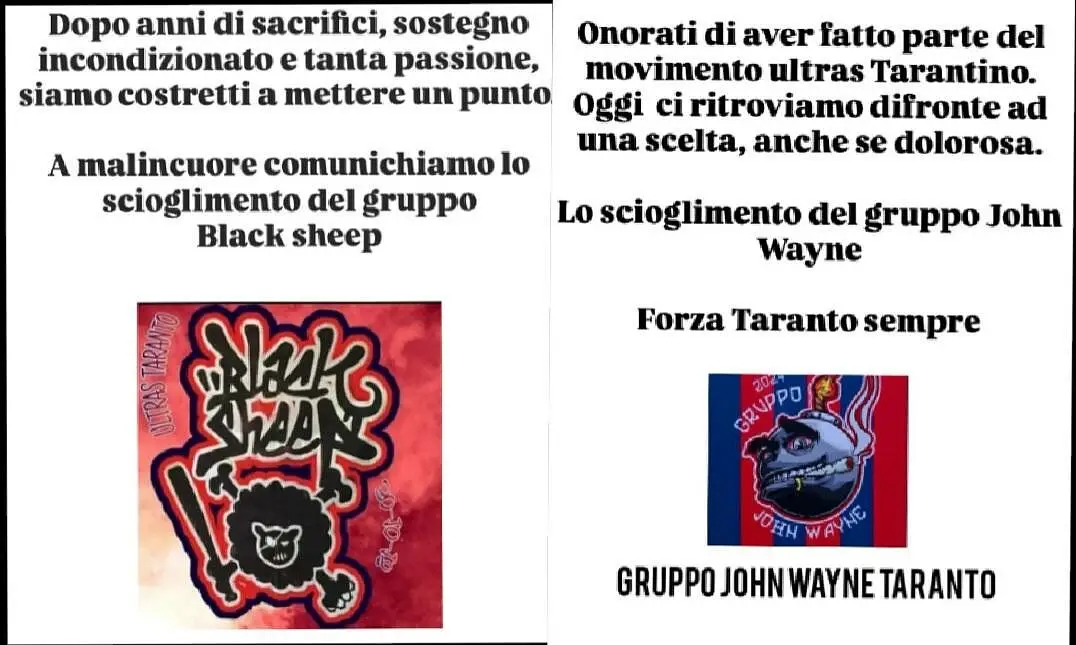“Onorati di avere fatto parte delmovimento ultras Tarantino. Oggi ci ritroviamo di fronte ad una scelta solorosa. Lo scioglimento del gruppo John Wayne. Forza Taranto sempre”.