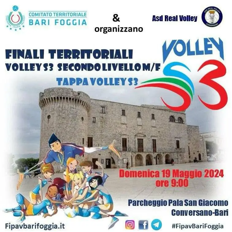In occasione della Finale Nazionale U18 Femminile che si disputerà il 19 maggio alle ore 9:00, presso il Palasport San Giacomo di Conversano sarà disputata anche la Fase Finale Territoriale del Trofeo volley S3 di secondo livello maschile e femminile. Il tutto è organizzato dal Comitato Territoriale Bari-Foggia e della Real Volley Conversano.