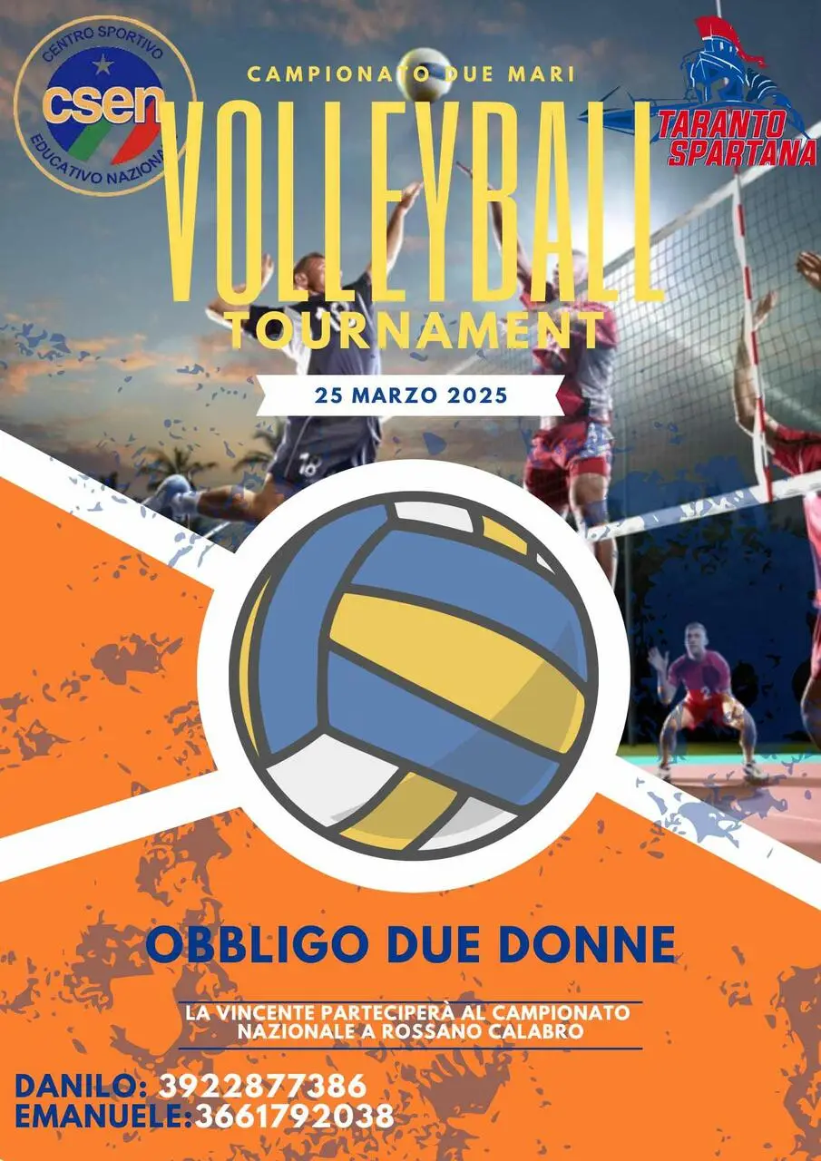 Sono aperte le iscrizioni per un altro grandissimo evento organizzato magnificamente da Emanuele Ciaccia e Danilo Bruno dell’ASD Taranto Spartana. Questa volta si parla di volley con il campionato Due Mari Volleyball Tournament che alzerà il sipario il 25 marzo. L’evento prevede l’obbligo di due donne in campo con la squadra che trionferà che parteciperà al campionato Nazionale di Rossano Calabro. Per maggiori informazioni chiamare al 3922877386 (Danilo) o al 3661792038 (Emanuele).