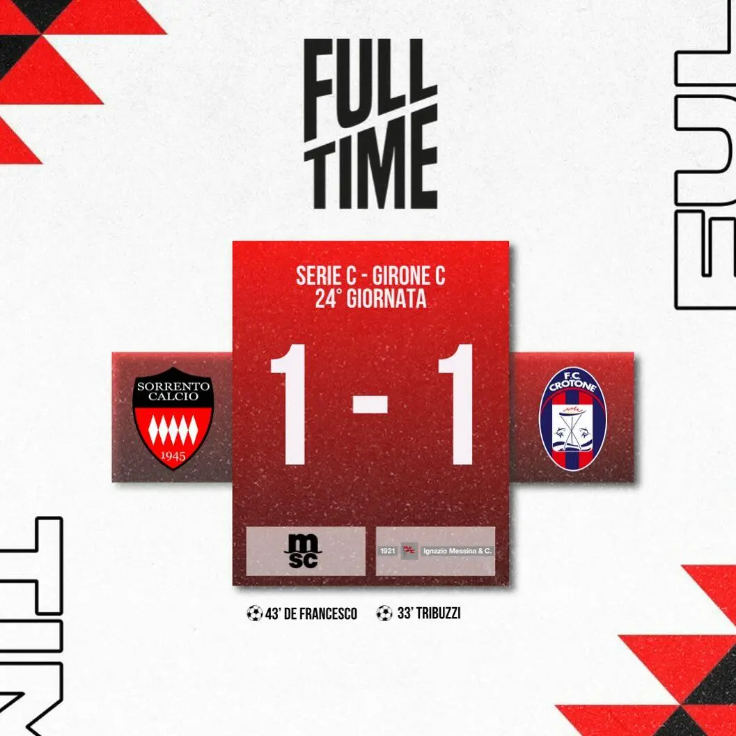 Sorrento (4-3-3): Del Sorbo; Todisco, Di Somma (86’ Vitiello), Fusco, Loreto; Messori (75’ Riccardi), De Francesco, Cuccurullo; Vitale (75’ Scala), Ravasio (86’ Martignago), Kolaj (63’ Badje). A disp.: D’Aniello, Albertazzi, Colombini, Bonavolontà, Capasso, Morichelli, Musella. All.: Maiuri