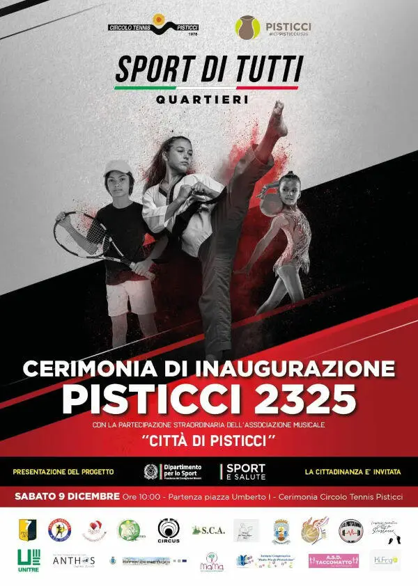 Si terrà il 9 dicembre la cerimonia di inaugurazione di ICPPISTICCI2325, serie di eventi sportivi e sociali organizzati dal Circolo Tennis Pisticci, società selezionata per attuare il progetto "Sport di Tutti - Quartieri”, realizzato in collaborazione con il Ministero per lo Sport e i Giovani attraverso il Dipartimento per lo Sport, insieme con Sport e Salute e il Comune di Pisticci.