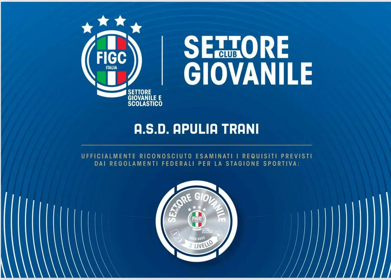 L’ASD Apulia Trani ha ottenuto per la stagione 2022/2023 il riconoscimento di club di 3° livello (Gold/Oro) che al momento è il massimo riconoscimento per i Settori Giovanili per il lavoro già iniziato nel corso dei precedenti anni (in cui vi è stato il riconoscimento di scuola calcio elite), confermato e migliorato anche in questa stagione. Indica il rispetto di diversi indicatori e requisiti che la FIGC prevede per i settori giovanili di tutta Italia, partendo dall’attività di base (Piccoli Amici-Primi Calci-Pulcini-Esordienti) fino all’attività agonistica giovanile (under 15 e under 17).