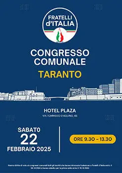 Si rende noto che il giorno 22 febbraio 2025 si terrà in Taranto, presso l’Hotel Plaza sito in Via d’Aquino 46, il Congresso comunale di Fratelli d’Italia Taranto che culminerà con l’elezione del Coordinatore comunale di Taranto e dei componenti del coordinamento cittadino.