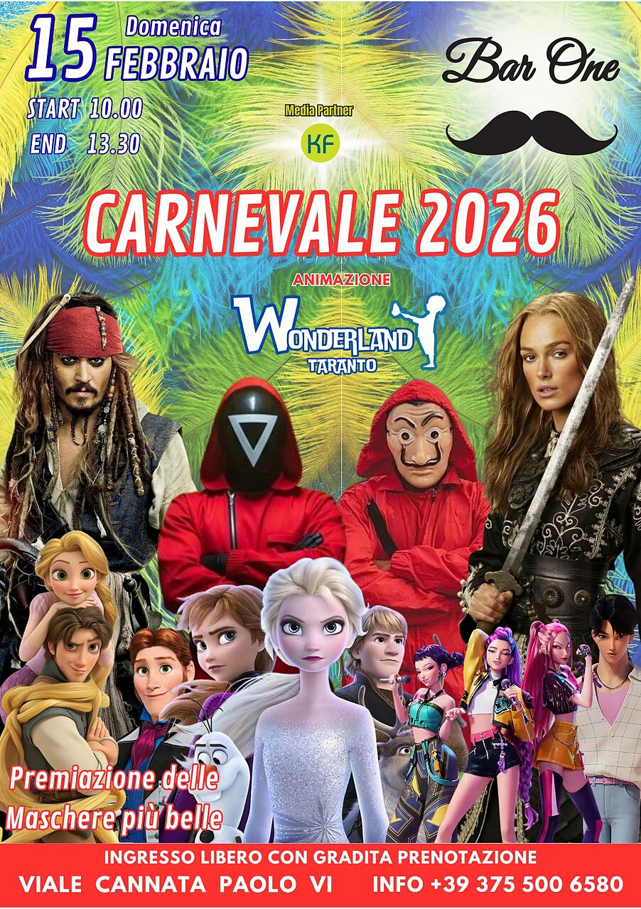 Un Carnevale che promette di trasformarsi in un vero e proprio spettacolo immersivo. Domenica 15 febbraio, dalle 10:00 alle 13:30, il Bar One di Viale Cannata a Paolo VI ospiterà il Carnevale Bar One 2026, evento firmato Wonderland Taranto, realtà creativa capace di coniugare animazione, intrattenimento e qualità artistica.