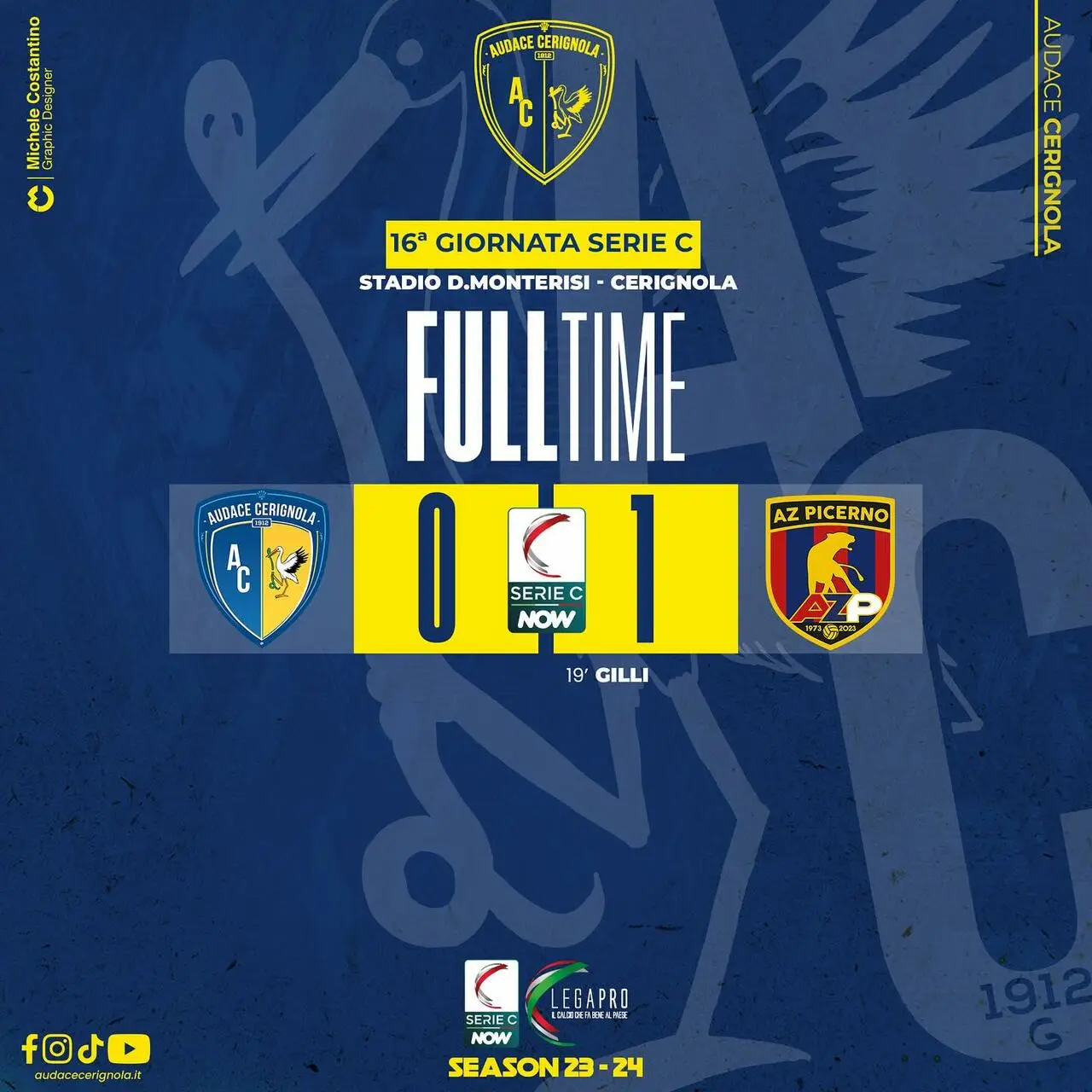 Ammonizioni: al 37′ pt Ruggiero Z. (Audace Cerignola), al 45’+1 pt Allegrini G. (Audace Cerignola), al 26′ st D’Andrea F. (Audace Cerignola) al 13′ pt Gallo A. (Picerno), al 45’+1 st Biasiol E. (Picerno).