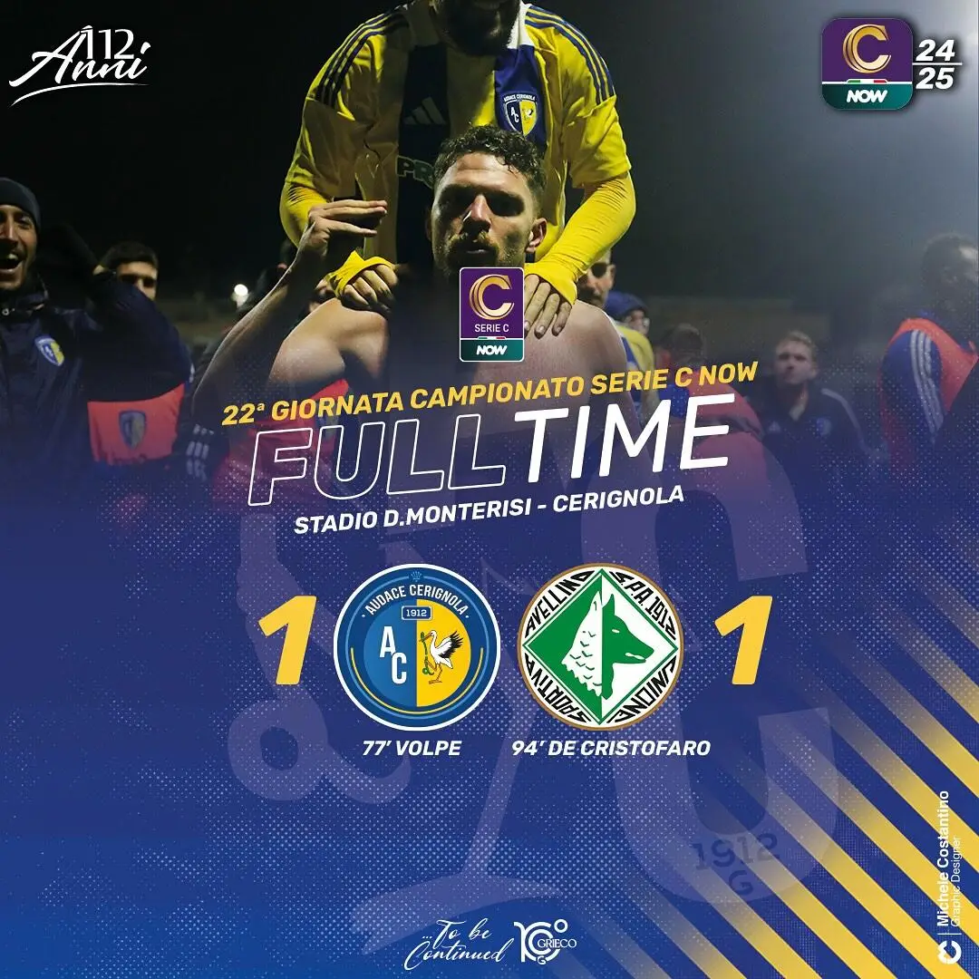CERIGNOLA (3-5-2): Saracco; Romano, Martinelli, Visentin; Coccia (41' st Gonnelli), Tascone, Capomaggio, Ruggiero (14' st Bianchini), L. Russo (26' st Volpe); Salvemini, Achik. A disp.: Greco, Fares, Parigini, Ingrosso, Jallow, Faggioli, Sainz-Maza, Velasquez, Carnevale, Ianzano, Carrozza. All.: Raffaele.