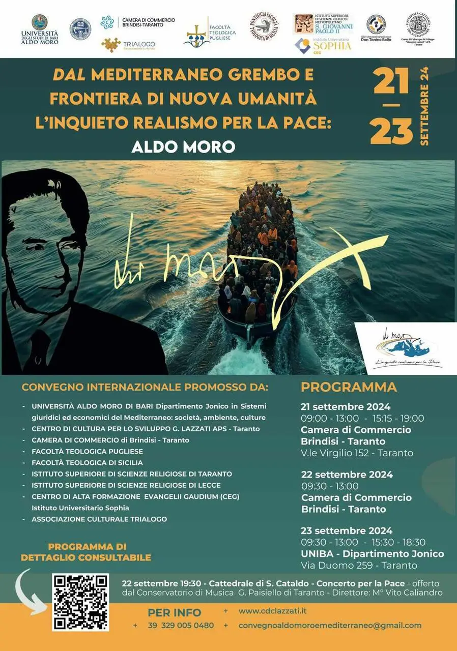 Il convegno “DAL MEDITERRANEO GREMBO E FRONTIERA DI NUOVA UMANITA’. L’INQUIETO REALISMO PER LA PACE: ALDO MORO”, che si terrà dal 21 al 23 settembre 2024 a Taranto, è organizzato da: Università Aldo Moro di Bari Dipartimento Jonico in “Sistemi giuridici ed economici del Mediterraneo: società, ambiente, culture”, Centro di cultura per lo Sviluppo Giuseppe Lazzati APS – Taranto, Camera di commercio di Brindisi -Taranto, Facoltà teologica Pugliese, Facoltà teologica di Sicilia, Istituto Superiore di Scienze religiose di Taranto, Istituto Superiore di Scienze religiose di Lecce, Centro di alta Formazione Evangelii Gaudium (CEG) Istituto Universitario Sophia e Associazione culturale Trialogo.