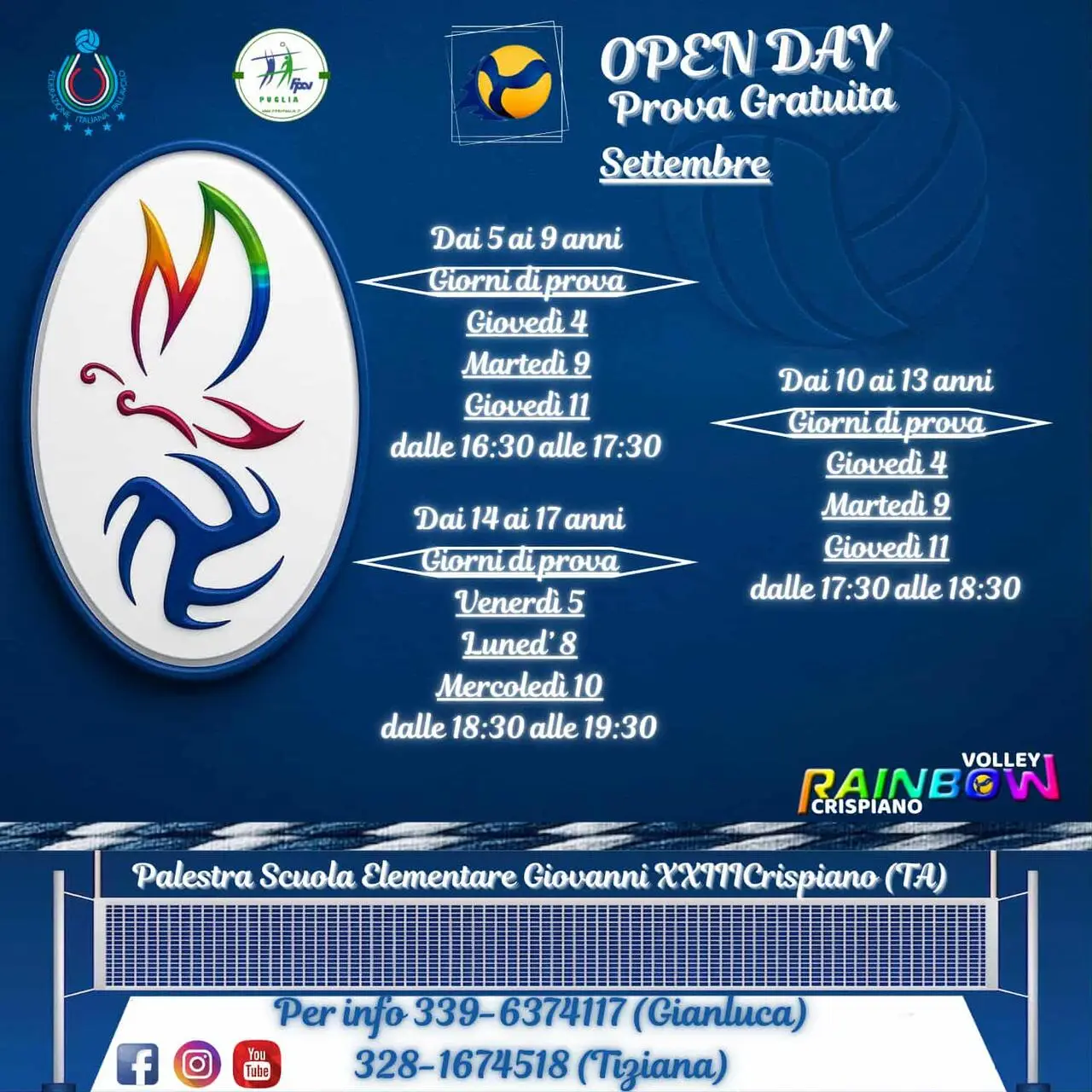 In casa Rainbow Crispiano è tutto pronto per la ripartenza e per affrontare al meglio la stagione 2025-26 attraverso una serie di Open Day gratuiti, presso la palestra della scuola elementare Giovanni XXIII, per bambini dai cinque ai nove anni, bambini dai dieci ai tredici anni giovedì 4 e 11 settembre e martedì 9 settembre (dalle 16:30 alle 17:30 per i primi; dalle 17:30 alle 18:30 per i secondi); mentre per i bambini dai quattordici ai diciassette anni venerdì 5, lunedì 8 e mercoledì 10 settembre dalle 18:30. Per maggiori informazioni chiamare Gianluca al 3396374117 o Tiziana al 3281674518. Venite a divertirvi e crescere con noi… Vi aspettiamo numerosi!