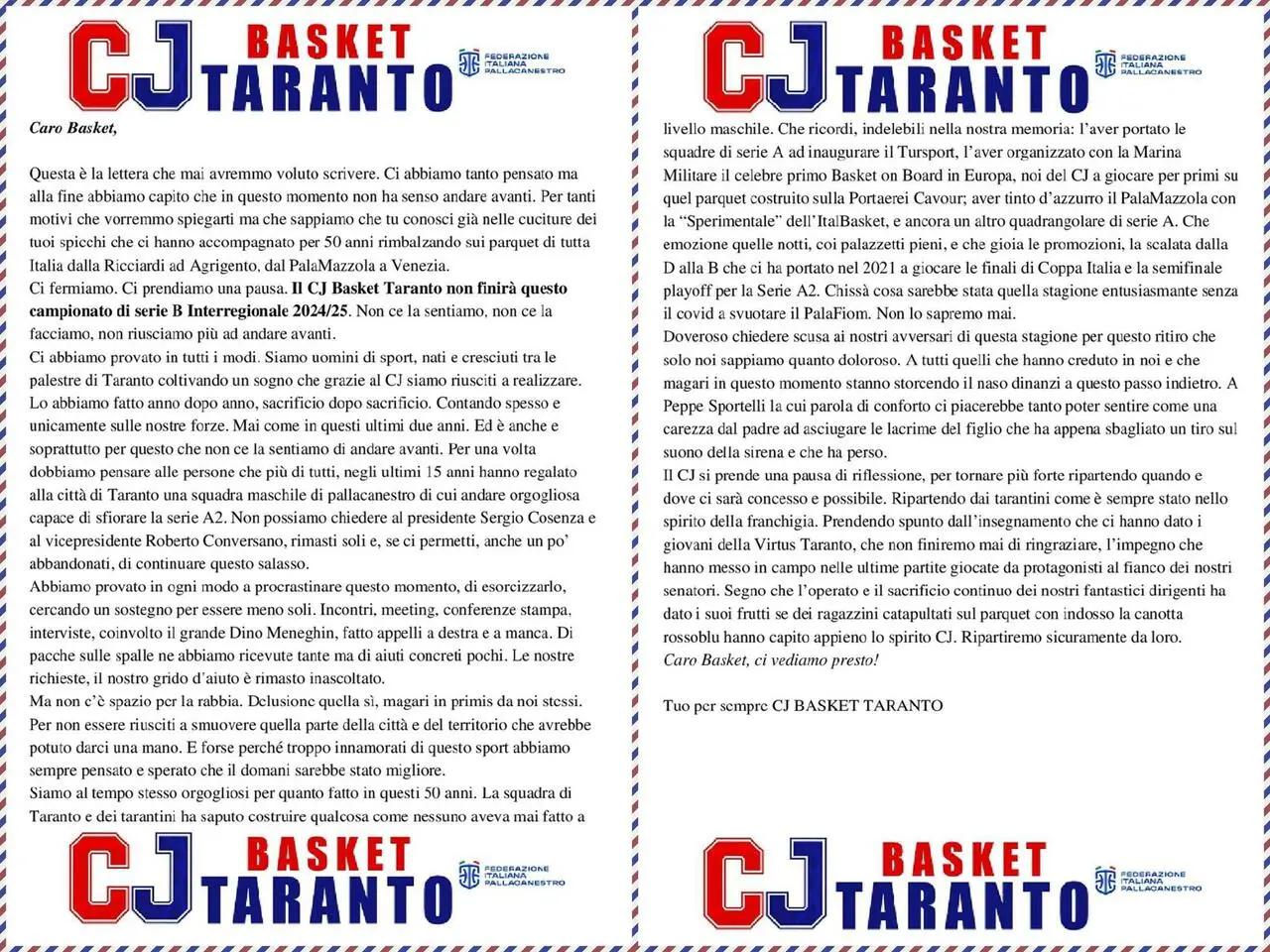 Questa รจ la lettera che mai avremmo voluto scrivere. Ci abbiamo tanto pensato ma alla fine abbiamo capito che in questo momento non ha senso andare avanti. Per tanti motivi che vorremmo spiegarti ma che sappiamo che tu conosci giร nelle cuciture dei tuoi spicchi che ci hanno accompagnato per 50 anni rimbalzando sui parquet di tutta Italia dalla Ricciardi ad Agrigento, dal PalaMazzola a Venezia.