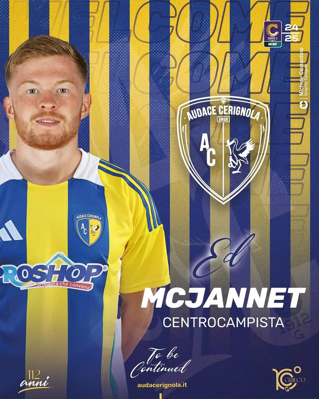 La ๐.๐. ๐๐ฎ๐๐๐๐ ๐๐๐ซ๐ข๐ ๐ง๐จ๐ฅ๐ ๐.๐ซ.๐ฅ. comunica di aver acquisito le prestazioni del calciatore Ed McJannet. Centrocampista, classe 2004, di nazionalitร irlandese. Giunge dallโU.S. Lecce con la formula del prestito fino a fine stagione. Ed Mcjannet arriva in Salento nel gennaio del 2023 giocando nella compagine Primavera. Nella sua seconda stagione mette a segno 6 gol e 7 assist in 33 presenze. In estate passa in prima squadra.