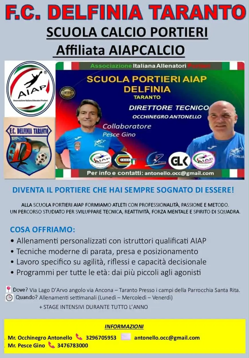Sogni di diventare un portiere? L’occasione giusta è dietro l’angolo grazie alla Scuola Calcio Portieri Delfinia Taranto affiliata all’AIAP Calcio in cui vengono formati atleti con professionalità, passione e metodo. Sotto l’attenta guida tecnica del Direttore Tecnico Antonello Occhinegro e del Collaboratore Gino Pesce si offrono allenamenti personalizzati, tecniche moderne di parata, presa e posizionamento; lavoro specifico su agilità, riflessi e capacità decisionali e programmi per tutte le età. Il tutto presso i campi della Parrocchia Santa Rita il lunedì, il mercoledì e il venerdì. Per maggiori informazioni chiamare Antonello Occhinegro al 3296705953 o Gino Pesce al 3476783000.
