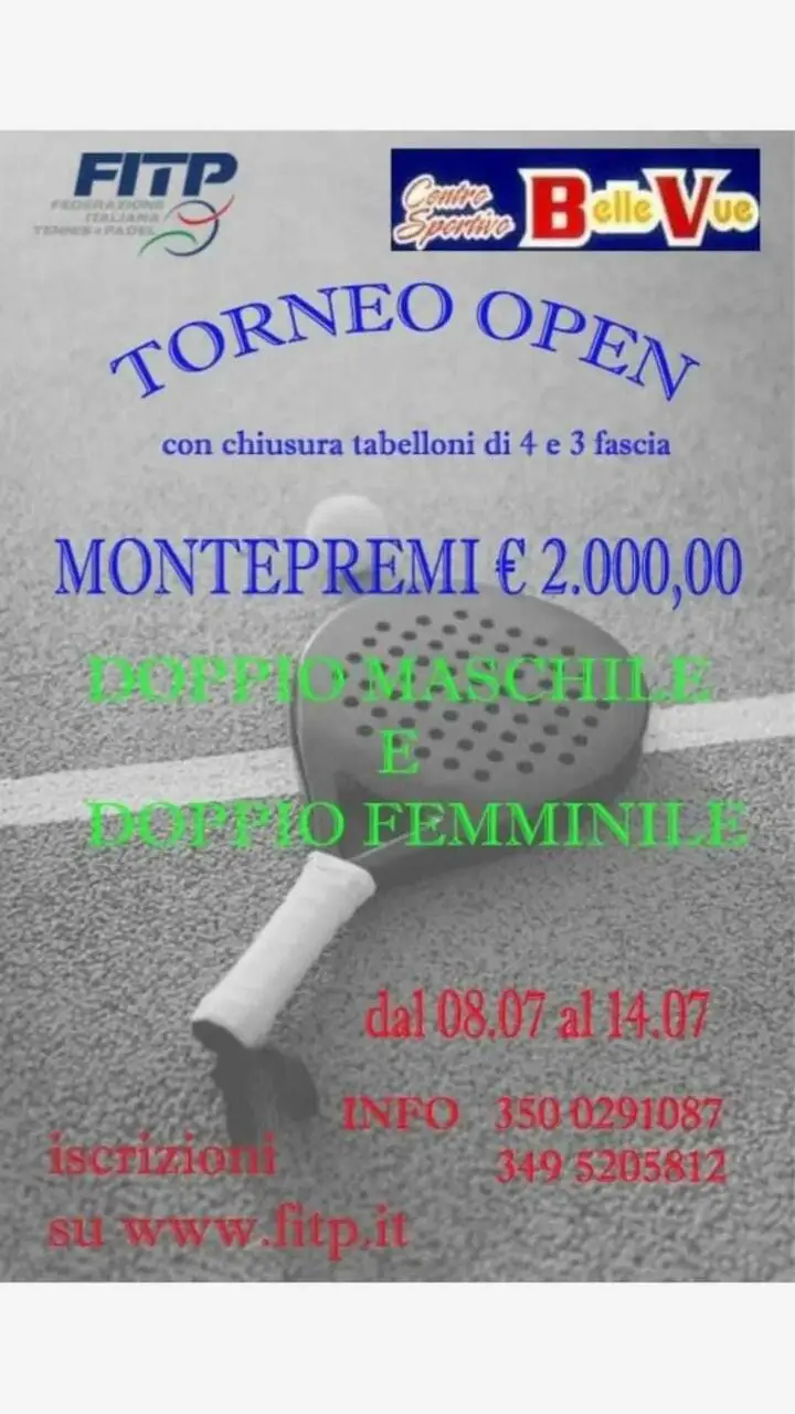 Ancora un grande evento di padel al Centro Sportivo "Belle Vue" che dall'8 luglio fino al 14 vedrà gareggiare atleti per un avvincente torneo di doppio maschile e doppio femminile con in palio un montepremi (totale da suddividere) di 2000 euro. Per iscrizioni consultare il sito www.fitp.it mentre per maggiori info chiamare il numero 3500291087 o il 3495205812.