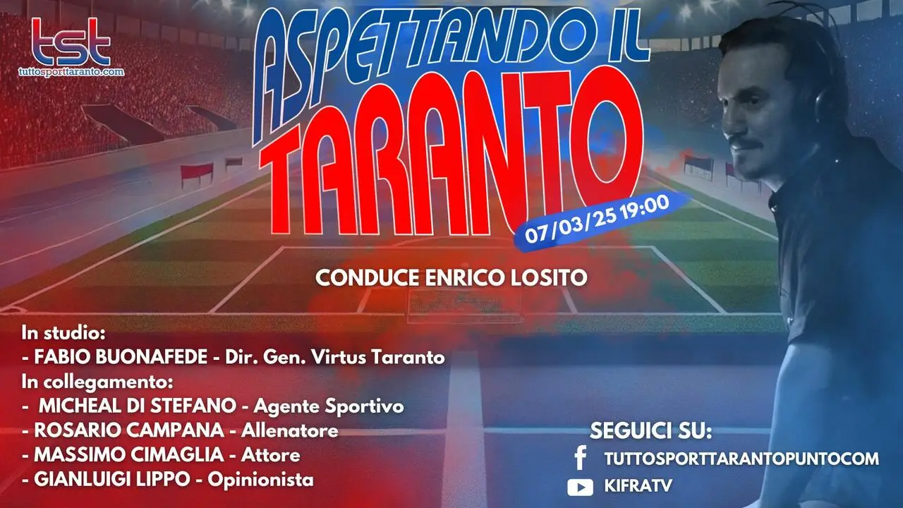 Venerdì 28 marzo dalle ore 19:00 in diretta dagli studi di Ki.fra Tv nuovo appuntamento con “ASPETTANDO IL TARANTO”, il contenitore sportivo a cura della redazione di Tutto Sport Taranto.com condotto da Enrico Losito con la regia di Claudio Ingrosso. Nel corso della puntata speciale parleremo della Fondazione Sport promossa da Massimo Ferrarese, Commissario Straordinario del Governo per i Giochi del Mediterraneo 2026. Ospite in studio: Fabio Buonafede, direttore generale della Virtus Taranto Calcio mentre in collegamento esterno ci saranno: Roberto Conversano, vice presidente Cus Jonico Basket Taranto; Mario Ortino, dottore in tecniche radiologiche; Dario Gallitelli, giornalista di Studio 100, il nostro Gianluigi Lippo. Vi aspettiamo in diretta sulle pagine ufficiali Facebook e Youtube di Tutto Sport Taranto e Ki.fra tv dalle ore 19:00 con le vostre domande, commenti e opinioni…NON MANCATE!!! Il contenitore sportivo è stato realizzato grazie al supporto di Ipersport in via per S. Giorgio Jonico km 10 (contrada Cimino) a Taranto; Studio Radiologico San Tommaso in via Luigi Settembrini, 232 a Talsano (TA); Studio Fornaro-Occhinegro dottori commercialisti associati, in Piazzale Dante, 8 a Taranto; in via Skanderbeg, 64 a Bari e in via Einaudi, 10 a Locorotondo (BA); Ottica Dierre in Corso Italia, 329/331 a Taranto; Birroteca Puglia in via Cataldo Nitti, 14 a Taranto; Erario Ottavio Srls – Costruzioni edilizie in via Don Minzoni, 2 a Manduria (TA), Guernica - cucina pizzeria tarantina in via Acclavio, 4-10 a Taranto, Peperoncino Rosso Trattoria, via S. Francesco 13/b a Statte (TA), 101 Desideri Floreali, Via Lama, 120 a Lama (TA).