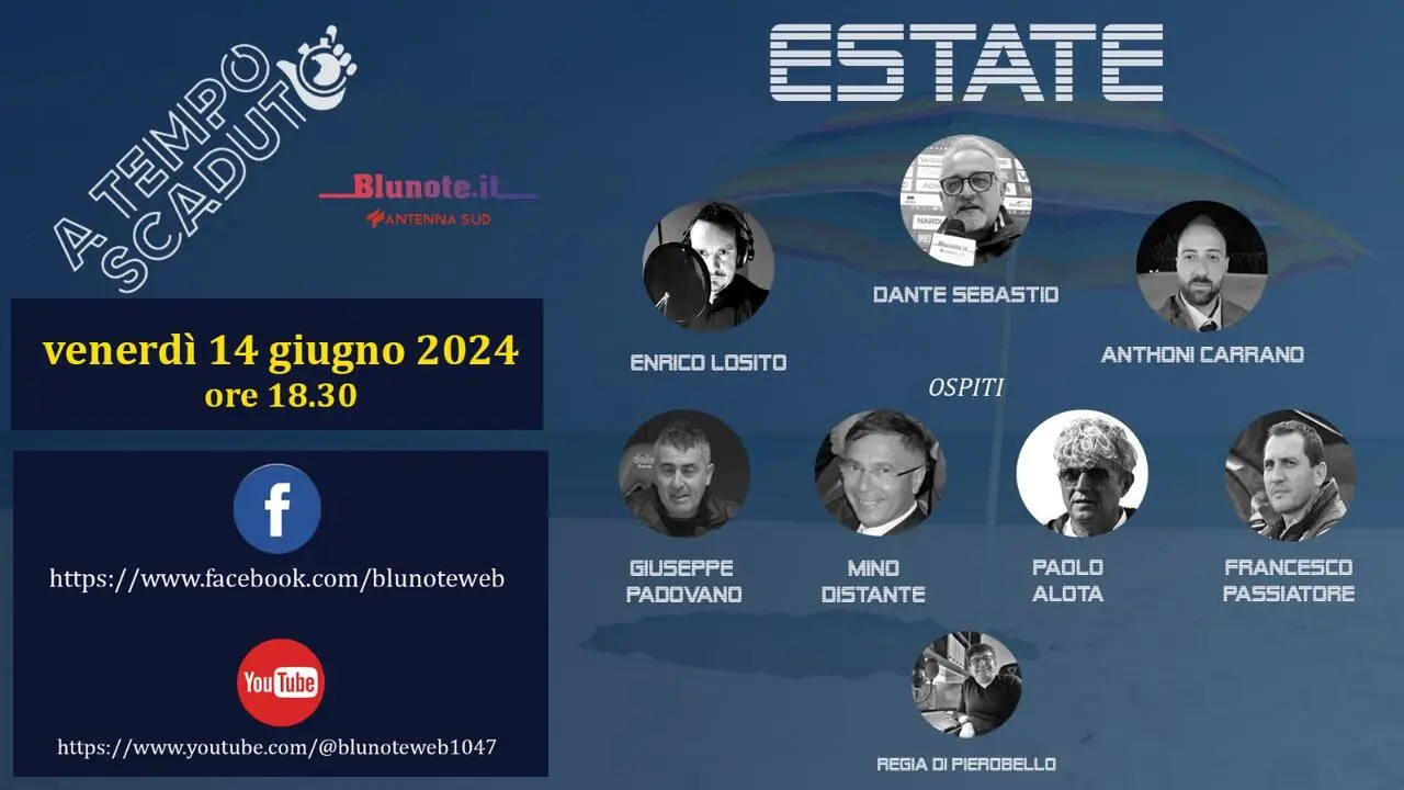 Venerdì 14 giugno dalle ore 18:30, appuntamento con “A TEMPO SCADUTO”, il contenitore sportivo a cura della redazione di Blunote.it condotto da Dante Sebastio ed Enrico Losito con la partecipazione di Anthony Carrano e la regia di Piero Bello. Sarà una puntata “scoppiettante” e ricca di ospiti: Domenico Distante, editore di Antenna Sud, Francesco Passiatore, ex allenatore e calciatore del Taranto e nostro opinionista, Giuseppe Padovano, allenatore “fresco” di promozione in B con la Carrarese, Paolo Alota, ex responsabile del settore giovanile del Taranto. Non è finita qui...Nel corso del programma previsto un collegamento con lo stadio Erasmo Iacovone per il Torneo Ant con ospiti a sorpresa. Commenteremo insieme le ultime novità relative al Taranto, vi aspettiamo in diretta sulle pagine ufficiali Facebook e Youtube di Blunote Web dalle ore 18:30! Il contenitore sportivo è stato realizzato grazie al supporto di Hotel Virgilio in Viale Virgilio, 4 a Taranto; Ipersport in via per S. Giorgio Jonico km 10 (contrada Cimino) a Taranto; Studio Radiologico San Tommaso in via Luigi Settembrini, 232 a Talsano (TA); Studio Fornaro-Occhinegro dottori commercialisti associati, in Piazzale Dante, 8 a Taranto; in via Skanderbeg, 64 a Bari e in via Einaudi, 10 a Locorotondo (BA); Studio Dentistico Sannelli Dr. Vito e Fabio Sannelli in viale Magna Grecia, 20 a Taranto, Ottica Dierre in Corso Italia, 329/331 a Taranto; CAFFE FADI e Onoranze Funebri “GLI ANGELI s.r.l.” H24 Attolino in via Monfalcone, 17 e in via C. Battisti, 90 a Taranto e in via V. Emanuele, 31/A a Leporano.